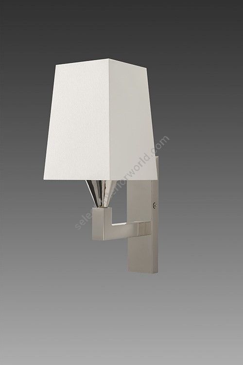 Wall light made in brass. Made with a fixed arm on a thin rectangular base. This simple and elegant wall light discretely fits into your interior. Available in black or matt gold patina, and in nickel or brushed nickel. Presented lamp shade in white cotton chintz in a tapered rectangular shape (see other available shapes and colours)
