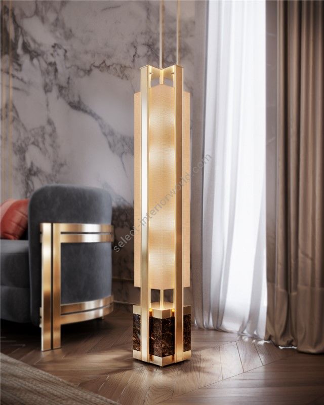 A perfect fusion of gold-plated brass structure and marble cube base highlights its smart functionality and unparalleled minimalistic beauty. This lighting design incorporates delicate details that secure the base and balance simplicity with the ultimate sophistication of its beige fabric lampshade. The aesthetically implemented 1.2m height lighting piece casts a soft light, bringing a timeless chic to the interior. All the exquisite product features are handcrafted from the finest brass and styled with high-end fabric by professional artisans.