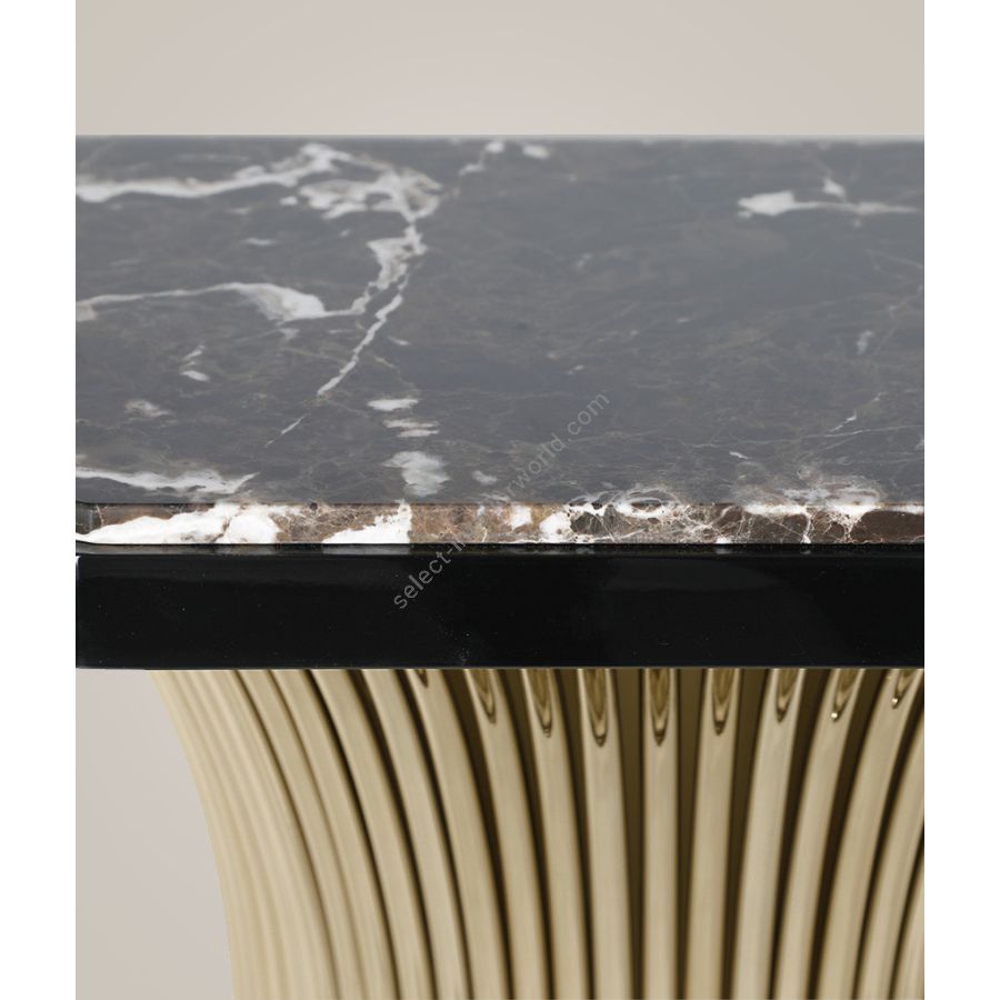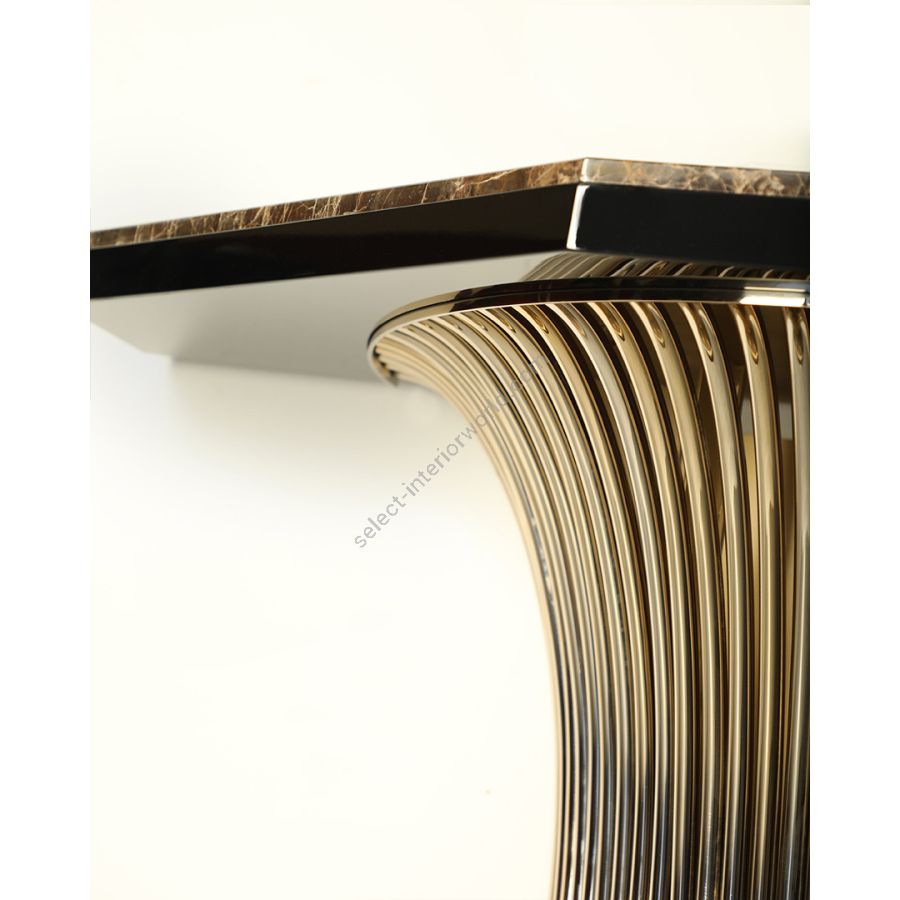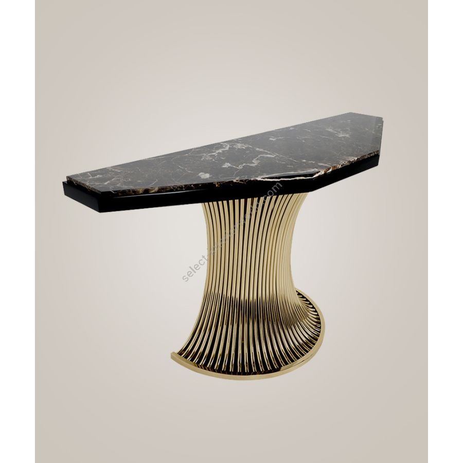 Featuring a unique design composed of a dramatic Emperador marble stone placed on top of bending brass tubes whose shape creates the visual sensation of a continuous flow. The Flusso Console brings a mesmerizing allure to any home interior and a feeling of mystery to the most exquisite décors. An authentically classy design, expertly crafted to bring elegance into a classic living room or dining area with its spectacular appearance. This lavish credenza will fit easily into a variety of interiors, from opulent Art Deco to contemporary chic.
