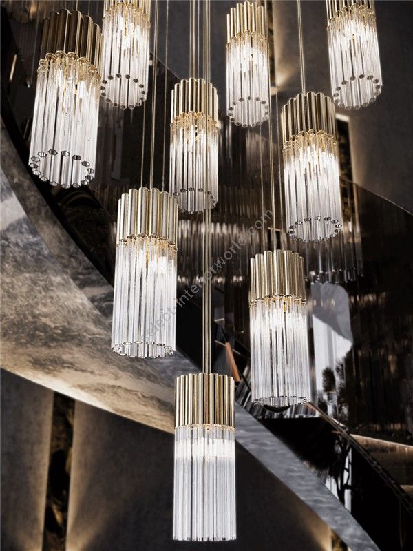 Gold-plated brass, masterfully combined with mesmerizing glass, provides an aerial atmosphere, full of bright and playful shooting amber rays of light. This opulent pendant light brings sensuality and a state of tender contemplative attitude and openness. A soft light that transmits class and purity to every space. It is a perfect match to different type of interiors: either classic, or modern.