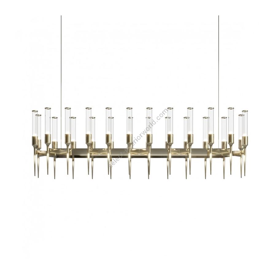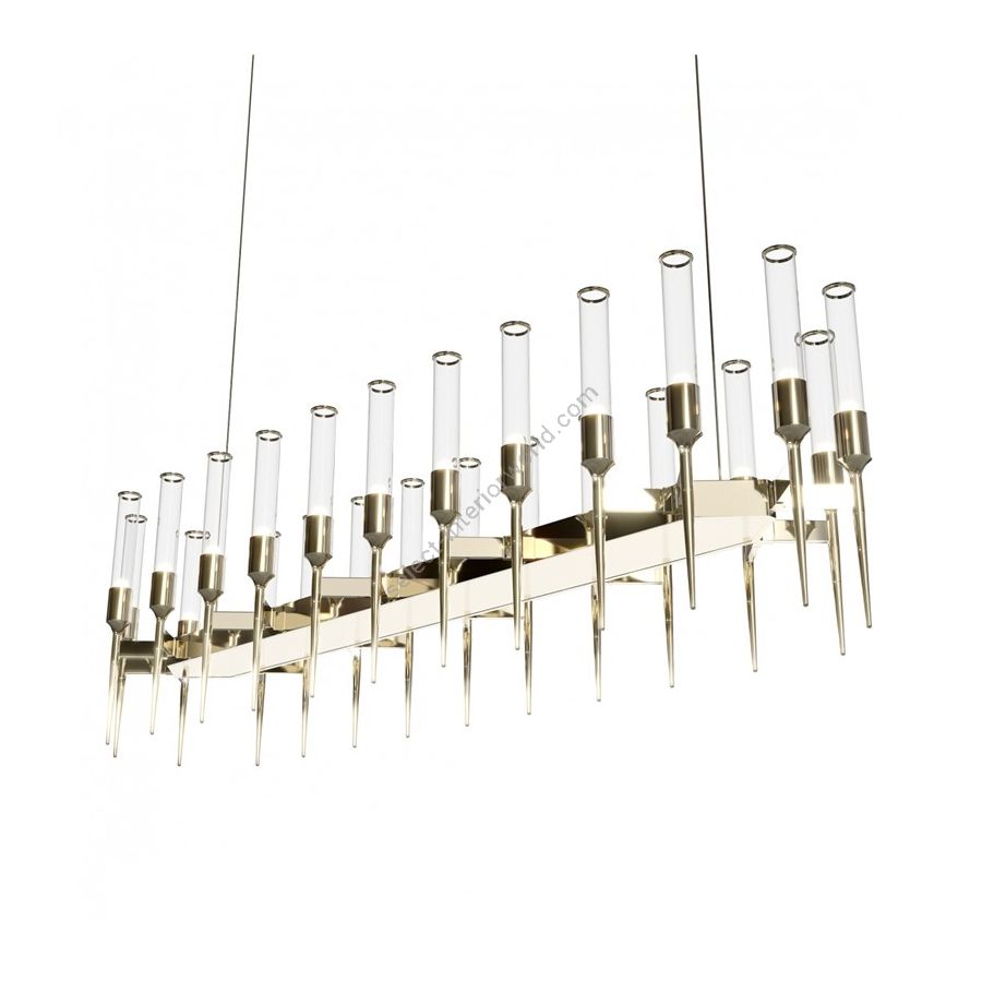 The Cielo suspension snooker proudly bears the name which in Italian is related to sky or heaven. This handmade lighting fixture is made of gold-plated brass, this snooker version creates an organic movement of subtle brass tubes complementing the luxury chandelier with clear glass. This finest lighting design is a beautiful addition to enhance large dining rooms, and modern living rooms. Cielo handcrafted in gold finish is the perfect choice for interiors with modern classic style, contemporary vibes, as well as art-deco touch. Feel the powerful energy of this suspension which brass elements complement the refinement of the interior and permit to reveal a new meaning of beauty. Simplicity, smooth texture, and clean glass lines help define this contemporary lighting design as the signature collection fitting to the most exquisite decors.