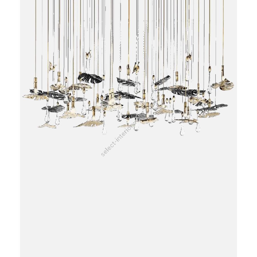 The Rainforest Collection arose from the timeless lighting celebration of nature silhouettes, its elements, and movements. Immerse yourself in the magnificent atmosphere of the sparkling Rainforest where the art of brass craftsmanship becomes luxury lighting design. The ultimate fusion between artistic design, the authenticity of traditional portuguese metal-work techniques, and creative craftsmanship. Rainforest Suspension is unparalleled in the refinement and grace it represents, owing to the gold-plated brass coupled with hand-applied clear crystal glass that confers a delicate charisma to the piece. Adorned with falling raindrops and butterflies, it takes you to remote spaces and the open sky.