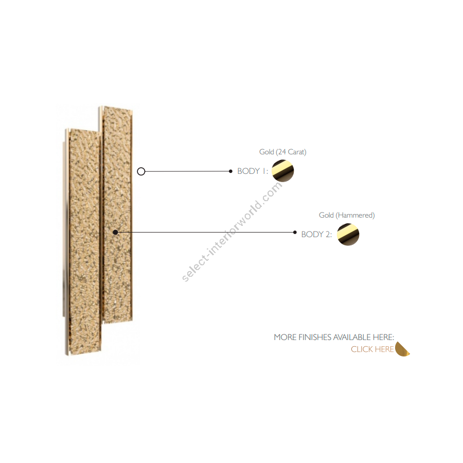 Composed of a rectangular shaped gold-plated brass plate – hammered by hand with modern handcraft technics – placed in the center of a semi-circle that allows warm light to spread through a small space in between this wall light design.