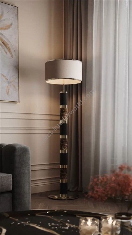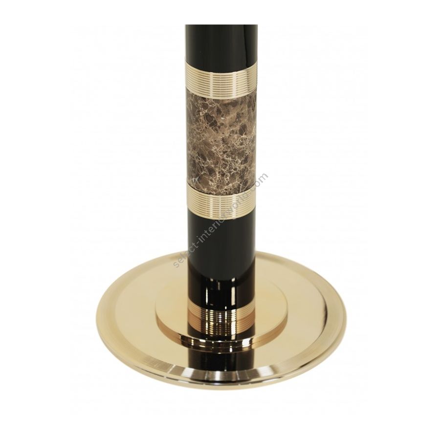 In this uplight, we can find emperador, a beautiful brown marble with soft golden threads. This stone conveys elegance to the whole design. Alongside the black lacquered wood and gold-plated brass rings, these are noble materials that confer grace and soften this bespoke piece. This brilliant combination of these three materials results in a premium piece that fits in with distinctive and refined decors.