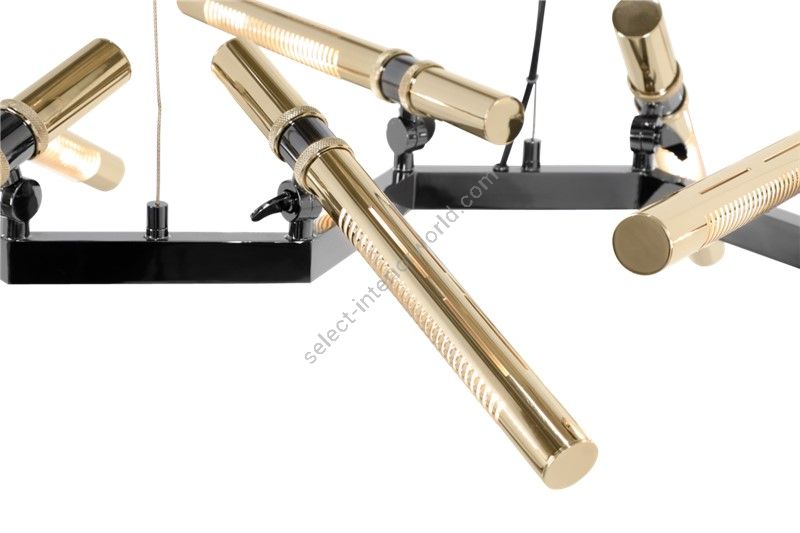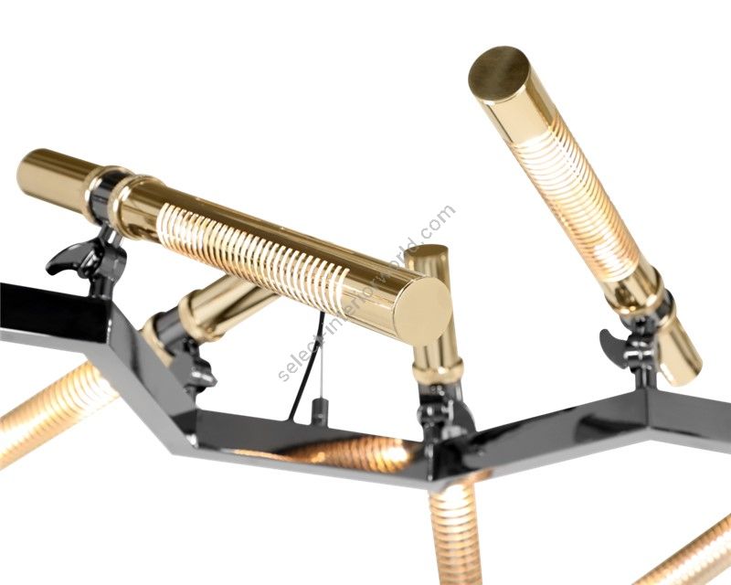 Falling in love with this stars-like piece, the Castro design team conceived this modern futuristic chandelier to be the center focal point in every wide room living area. Highlighting the natural shape of a group of stars forming this minimalistic but strong-will suspension. This handmade fixture is all made in brass with a mixture of black nickel and gold finishes.