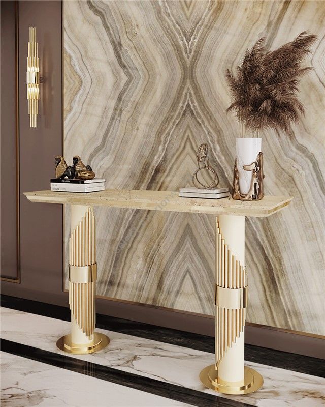 This elegant console features long gold plated brass tubes that give all the designs a whole exclusive and deluxe look, setting another level by their distinctive appearance. This recipe of rich materials, such as the brass and the Black Marquina marble, and sleek lines inspired by art-deco architecture make the Streamline piece desirable.