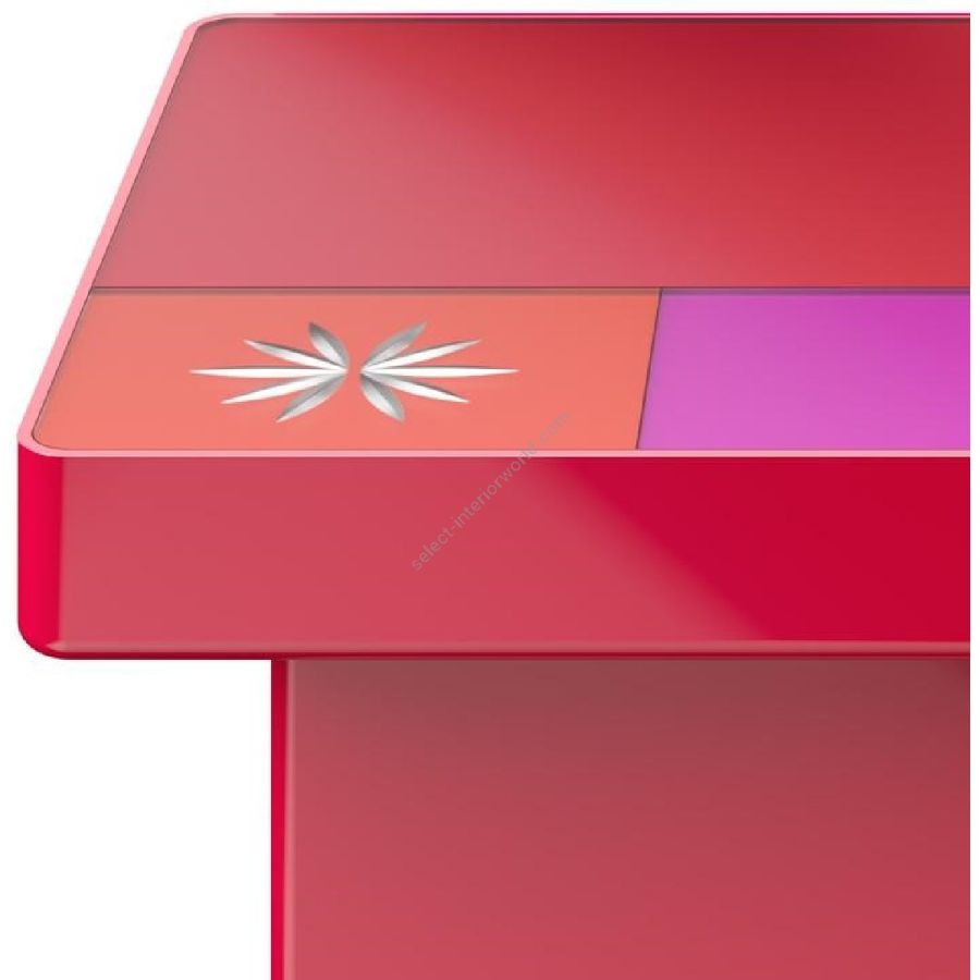 Top with extra-clear acid etched 6 mm thick glass varnished in multicolour and decorated with silver hand engravings.