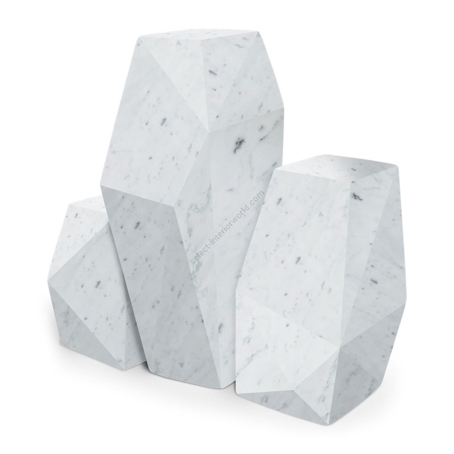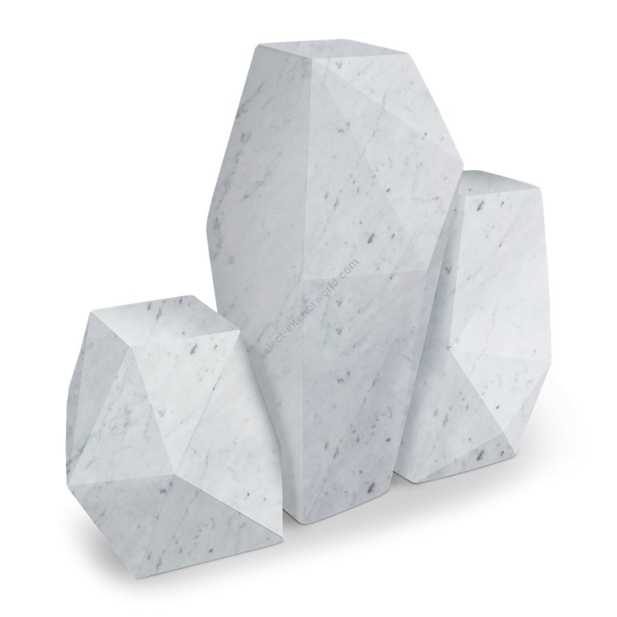 Inspired by prehistoric monolithic standing stones, this set of three faceted plinths carved from white Carrara marble can be used as a standalone artwork, or to display sculptures or other artworks.