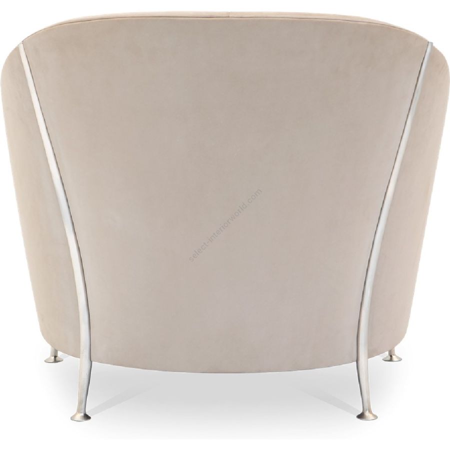 The distinctively upholstered back in a scalloped design flows elegantly into the sumptuous seat cushion of this occasional chair. Sweeping arms are complemented by hand-wrought metal legs.