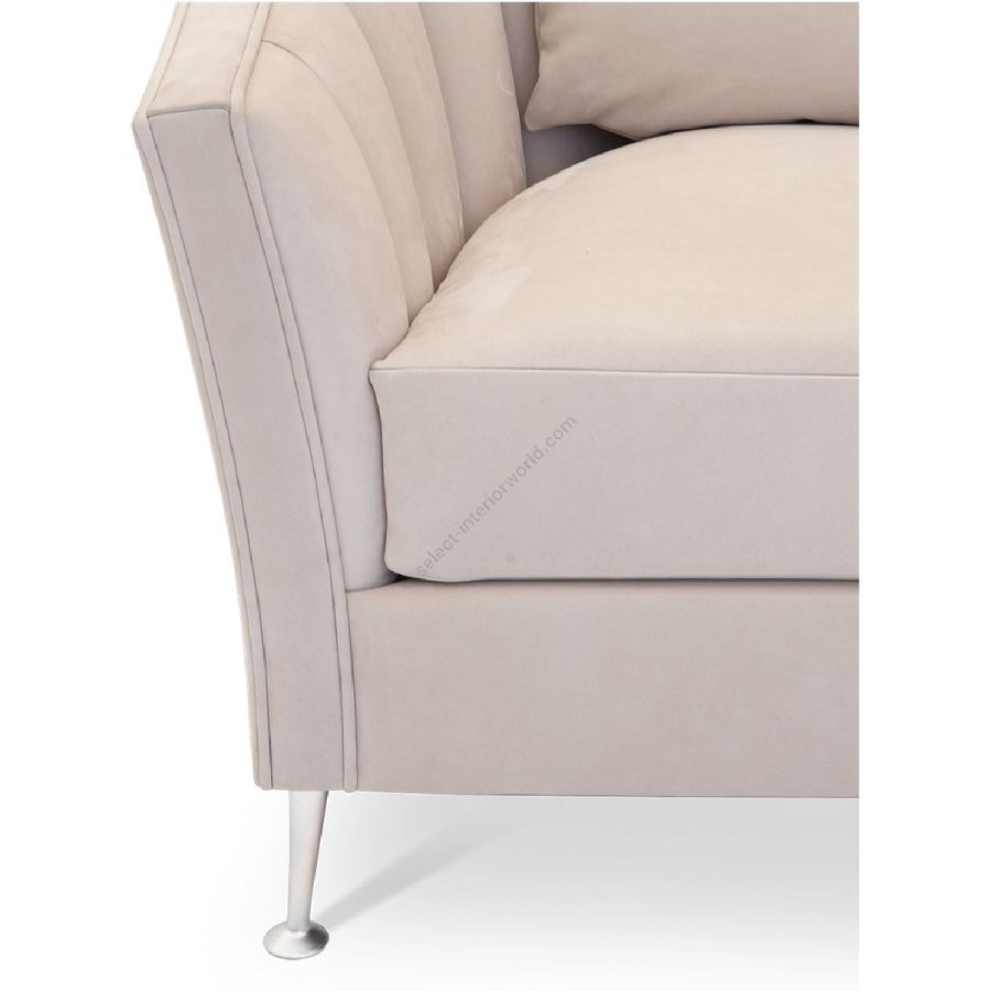 Doweled mortise and tenon frame in solid Mahogany from certified source. Solid brass mid-century legs. Eight-way hand tied spring base, with pocket coil seat cushions encased in high-resilient fill and feathered down jacket. Feathered down throw pillows mixed with PolyFiber for added support. Channeled backrest. Available in a selection of finishes. For residential use only. Commercial use is classified as Special Order Design (SOD), and alternative materials may be required. Contact us for details.