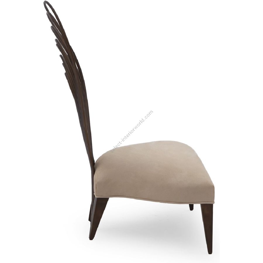 A fabulous statement piece, this unique occasional chair features an unusual metal back with concentric swirls, wide tapered legs and a sumptuous upholstered seat. Also available in left back 60-0411.