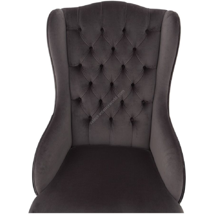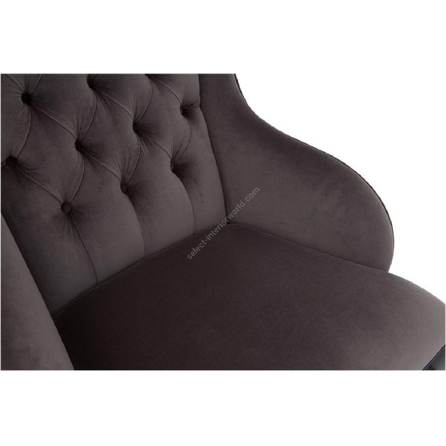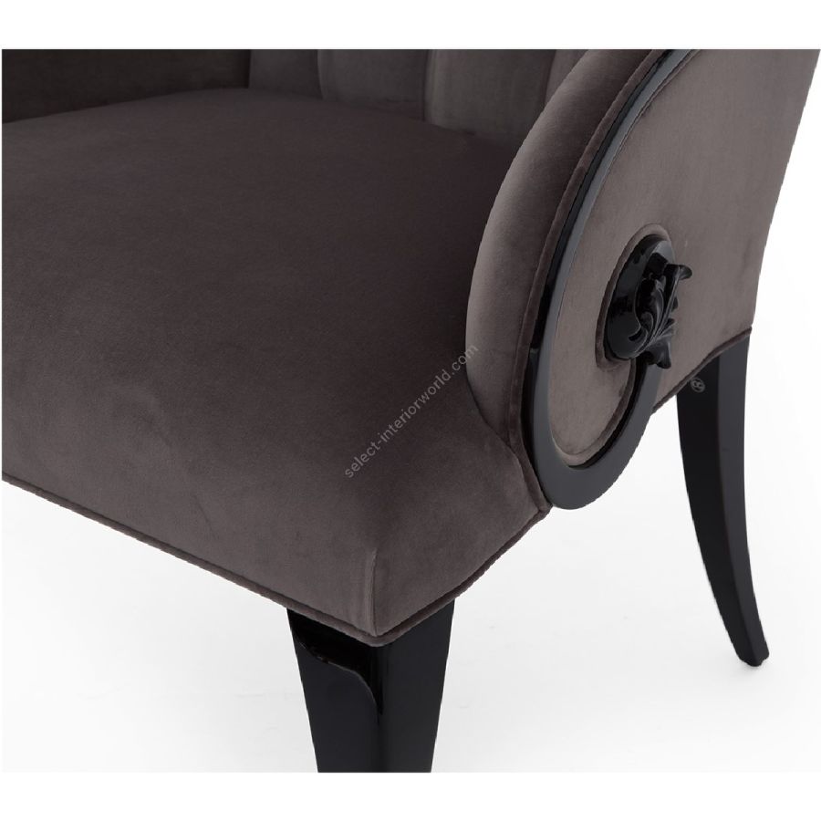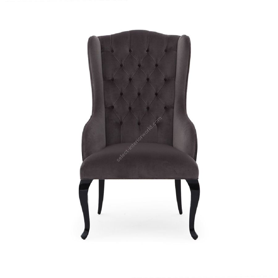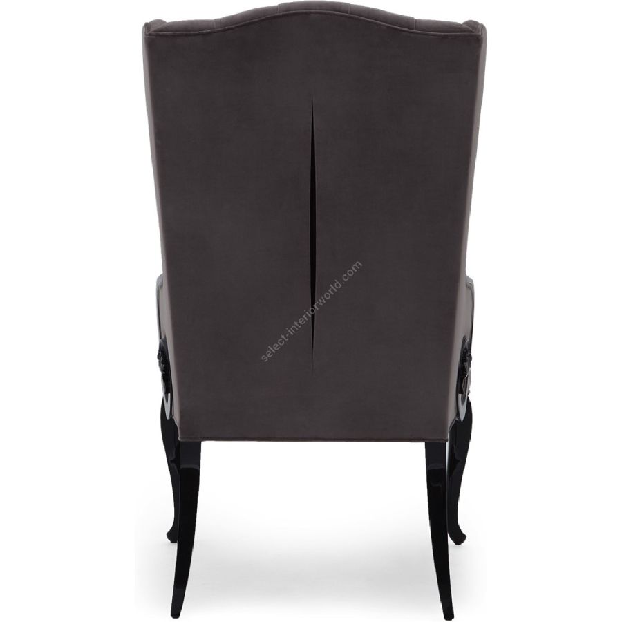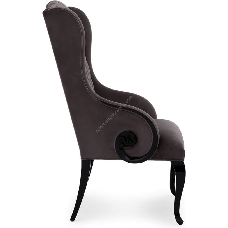 The curvaceous silhouette features a diamond tufted back with scroll arm detail. Designed to head a dining table, while perfectly at home as a lounge chair.