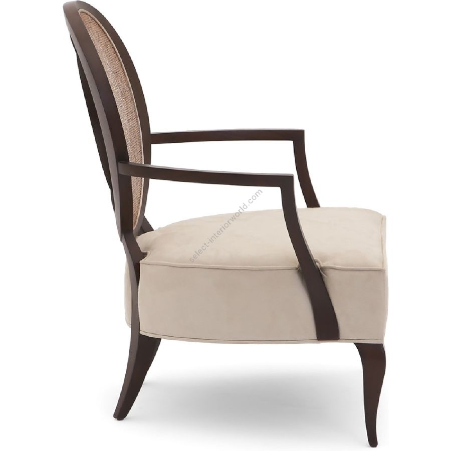 An artfully understated lounge chair with a sumptuously upholstered seat and a distinctive oval back of hand-carved mahogany. Cabriole legs balance the Deco style mahogany arm rests.