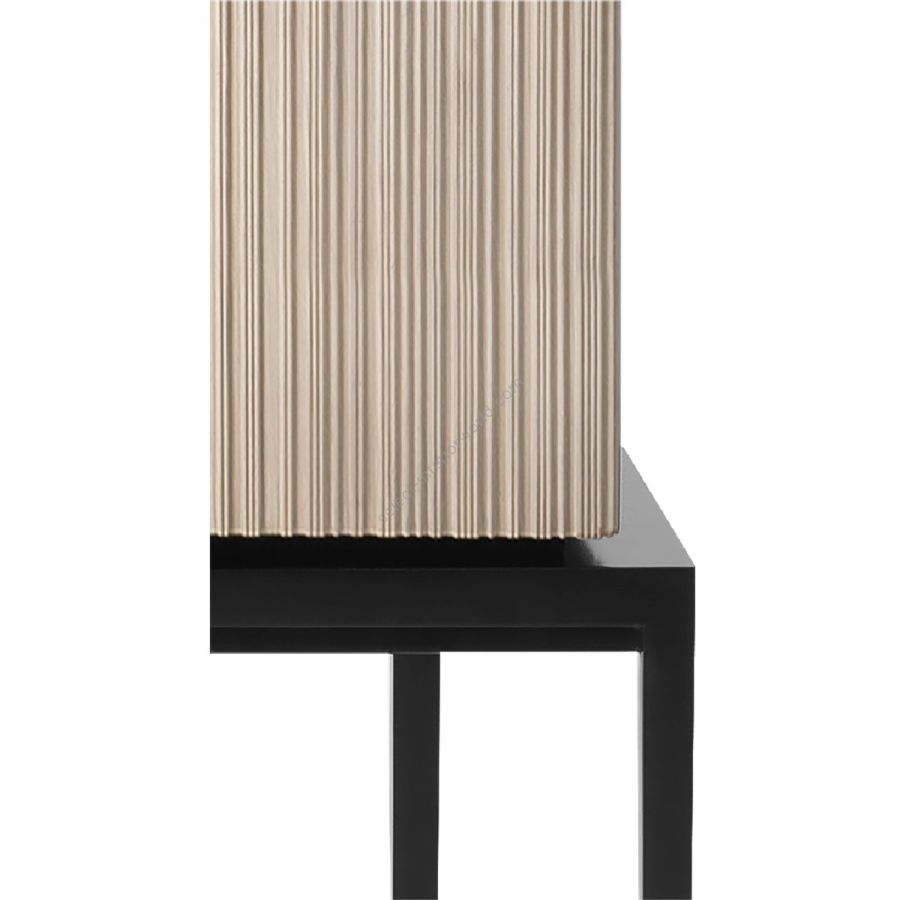 A sleek design with intricately carved reeded doors, accented by the CG signature knot, this tall bar cabinet features shelving for wine, spirits and stemware storage. The cabinet is perched atop metal 'stiletto' supports. Also available in a larger version (88-0010).