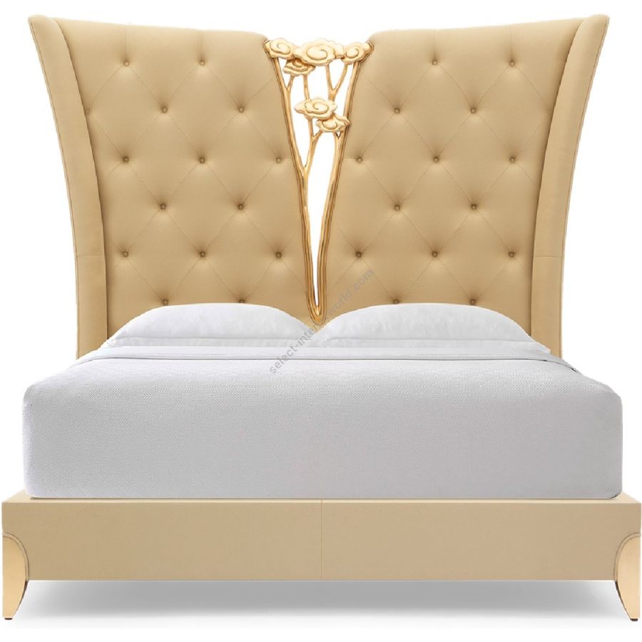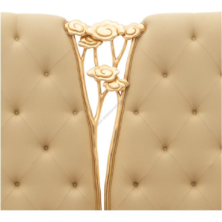 A spectacular bed featuring Christopher’s signature hand-carved camelia, perfectly complemented by the sumptuous tufted upholstery and encased within gently curving borders.