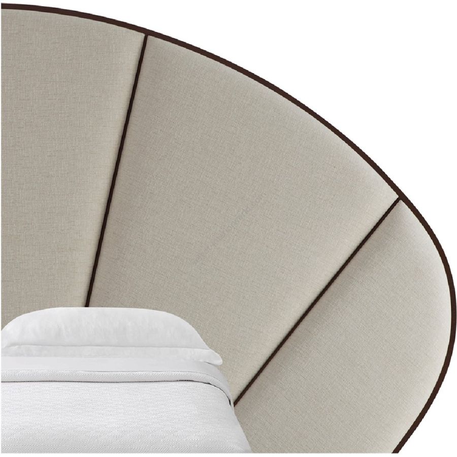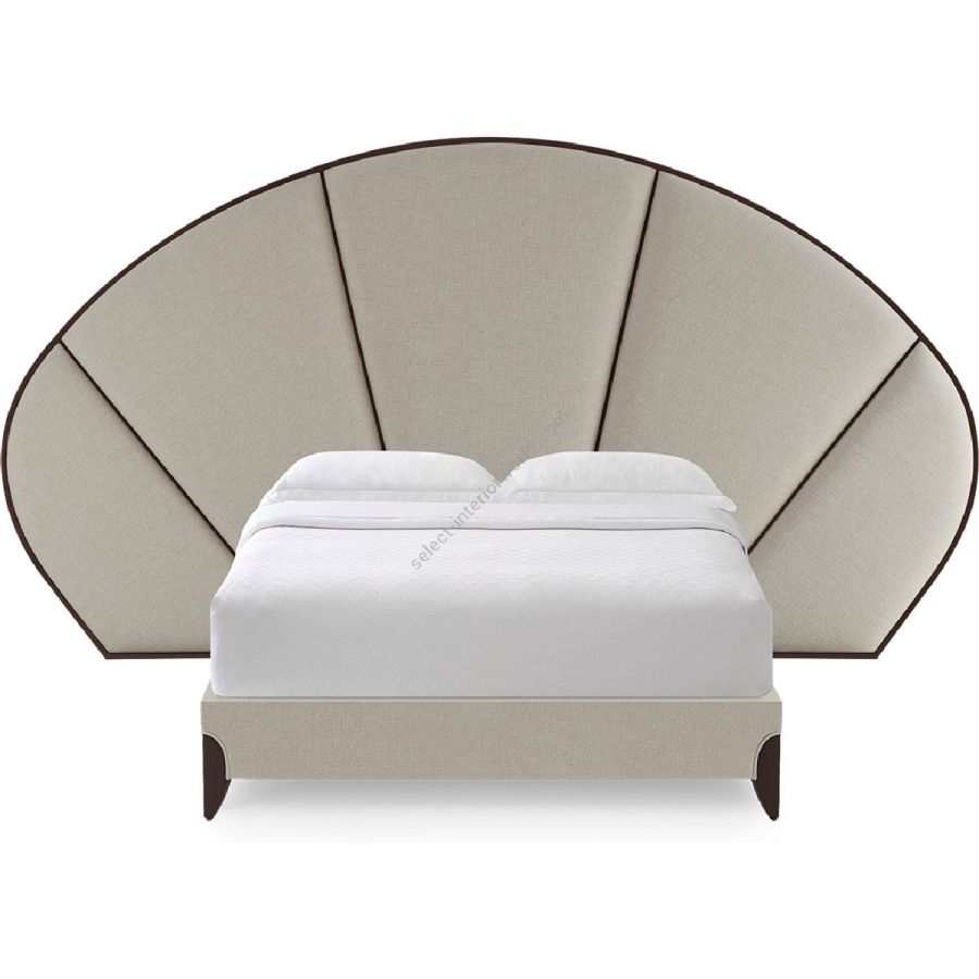 Inspired by a beautiful 1920s handheld fan, the bed features carved detailing and five sumptuous upholstered panels.