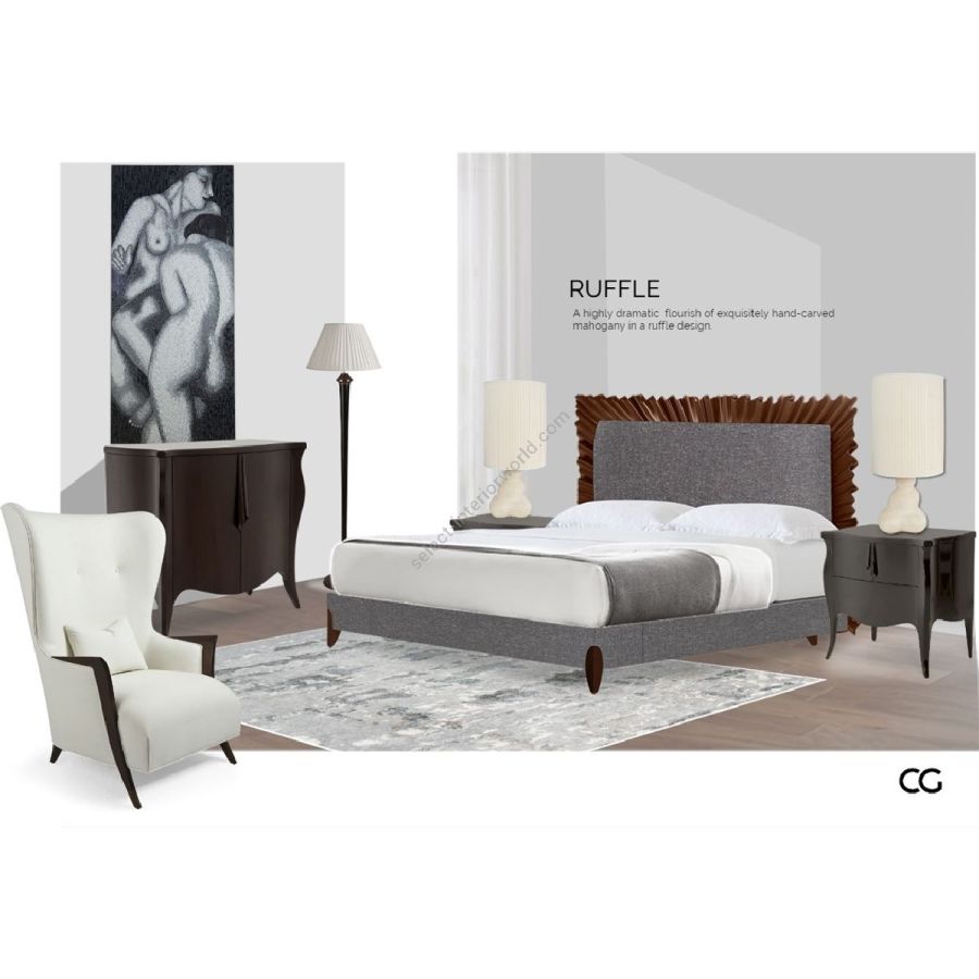 A highly dramatic flourish of exquisitely hand-carved mahogany in a ruffle design.
