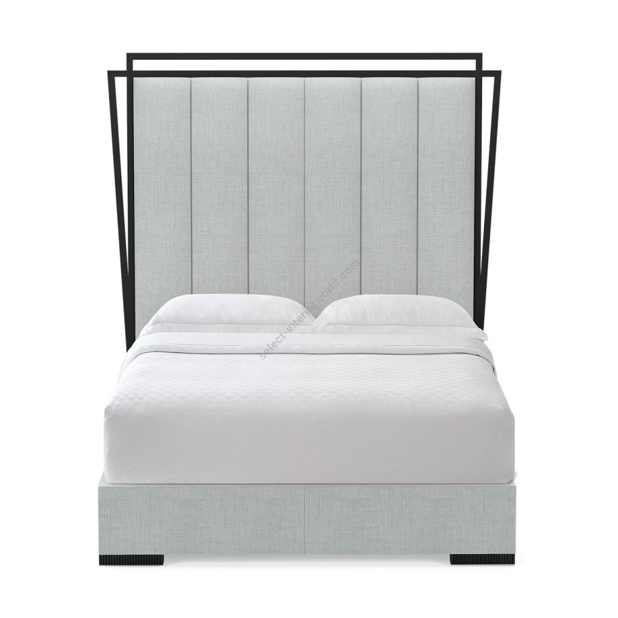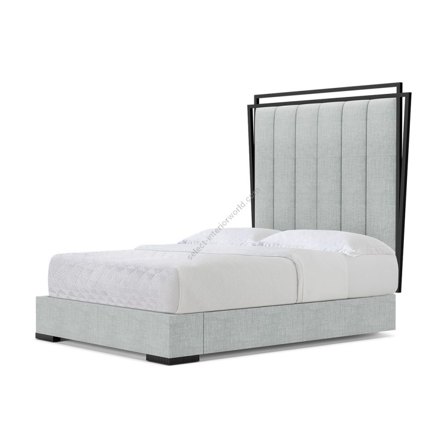 Contemporary bedroom settings are taken to the next level with this striking bed, characterized by a high geometric hand carved frame around a rectangular board upholstered with vertical seamlines, and a bed base with shallow squared feet.