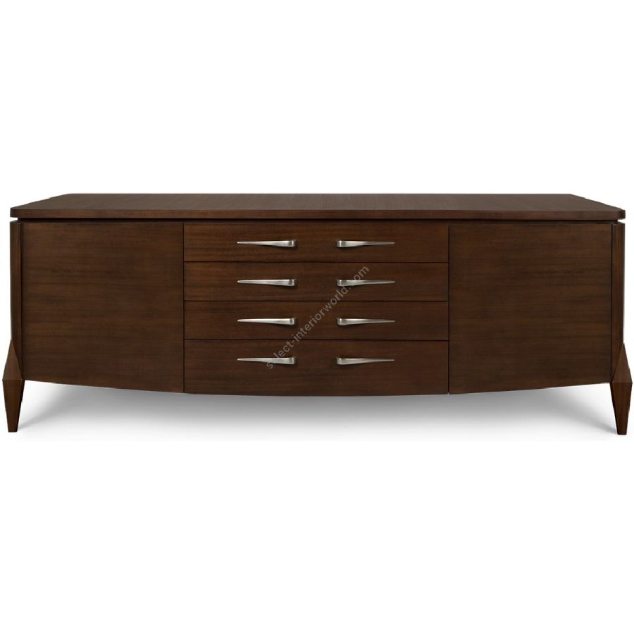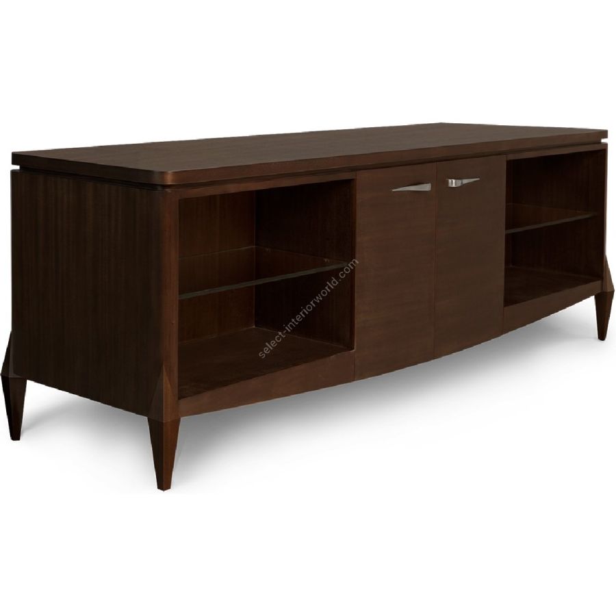 Magnificent double-sided cabinet, with handles derived from a rare 1950s Bentley seen by Christopher on the streets of London's Mayfair. Features 4-drawers and two wing doors with removable shelving. The opposite side features central doors with removable glass display shelving. Ideal for dividing a dining and living space. Available in two sizes.