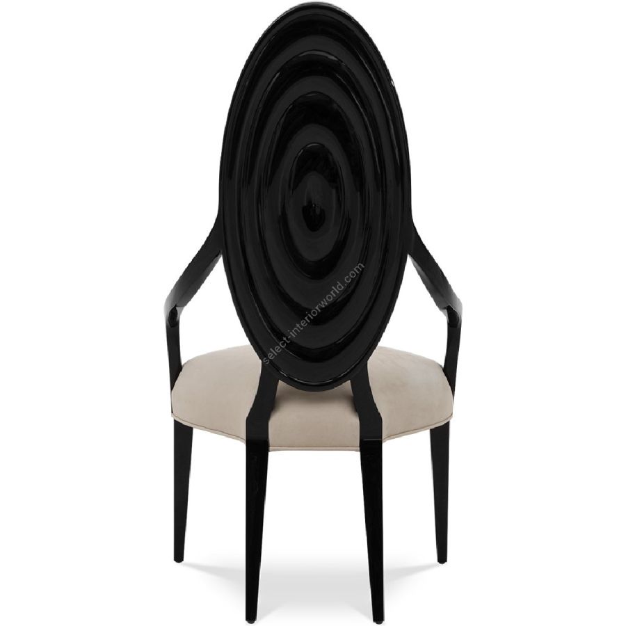 A striking dining chair featuring a tall oval upholstered backrest with the rear exquisitely hand carved into concentric circles. The back is supported on pivoted, slanting straight legs, and the arms descend in a curve for an elegant profile.