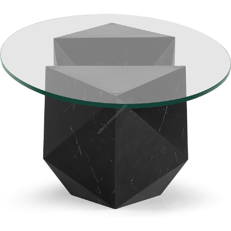 This stunning coffee table features a clear tempered glass top and diamond shaped bases in a choice of white Carrara or Nero Marquina marble.