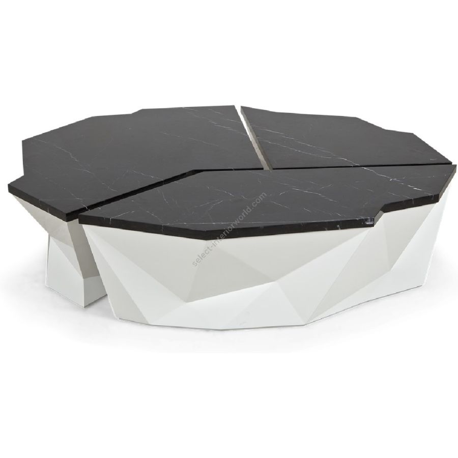 Monumental coffee table design in carved wood with a marble top featuring three individual faceted geometric sections, which can be slotted together or used independently.