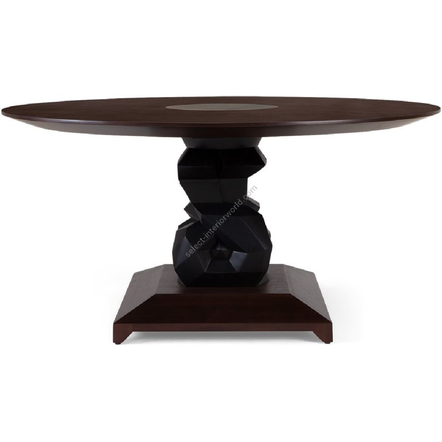 An imposing circular dining table design with hand-sculpted mahogany bases crafted into polyhedron shapes for a spectacular statement piece. The tabletop is expertly joined as four quarters, displaying the beauty of the wood grain.