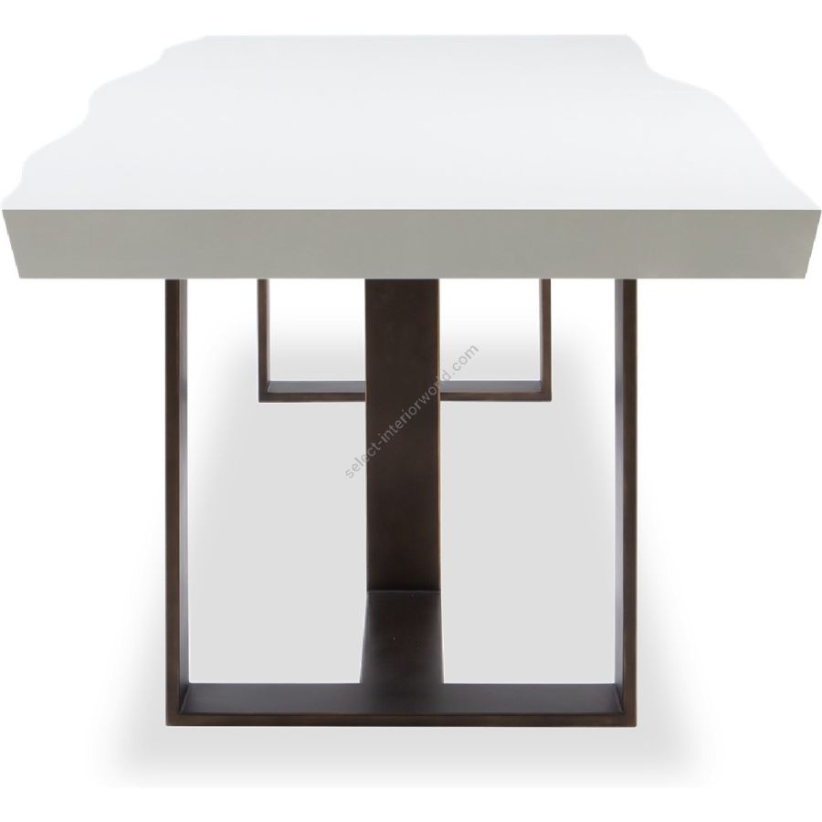 This highly impressive dining table, mimics the sawn plank of an oak tree with natural uneven edges. The base consists of two bronzed steel supports.