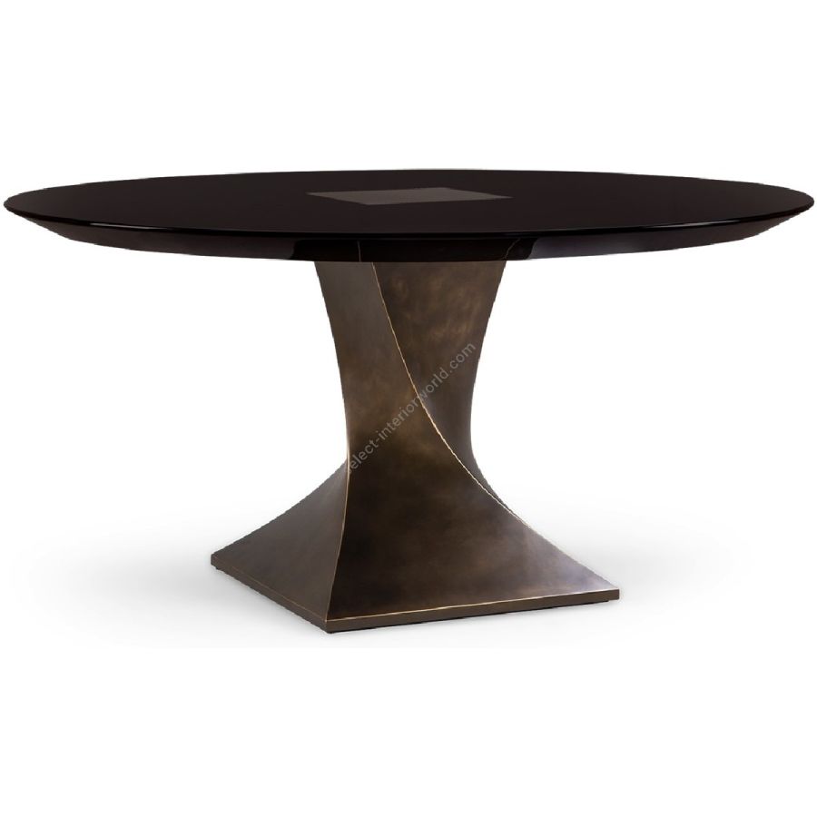 Contemporary living with a twist, this circular dining table features a twisted pedestal that protrudes through the veneered surface. The chiseled base is offered in a fabulous bronzed finish.