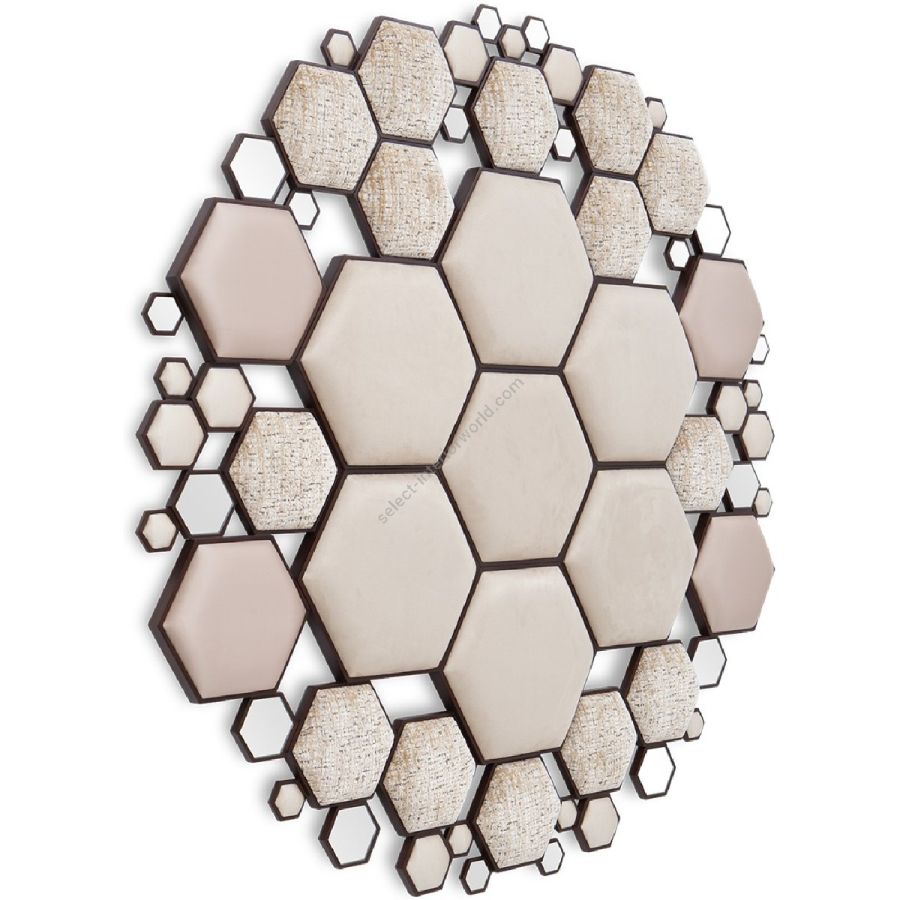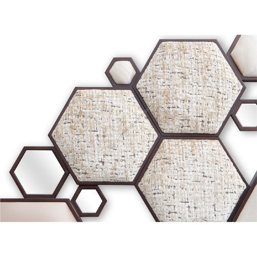 Inspired by the French-Hungarian artist credited as the grandfather and leader of the Op Art movement, Vasarely is an exquisite and mesmerising headboard formed of a total of 62 various sized upholstered and mirror hexagons in wood frames forming a sparkling circle. Made to fit any standard size of bed. Simply spectacular! Also available with upholstered only hexagons (20-0799)
