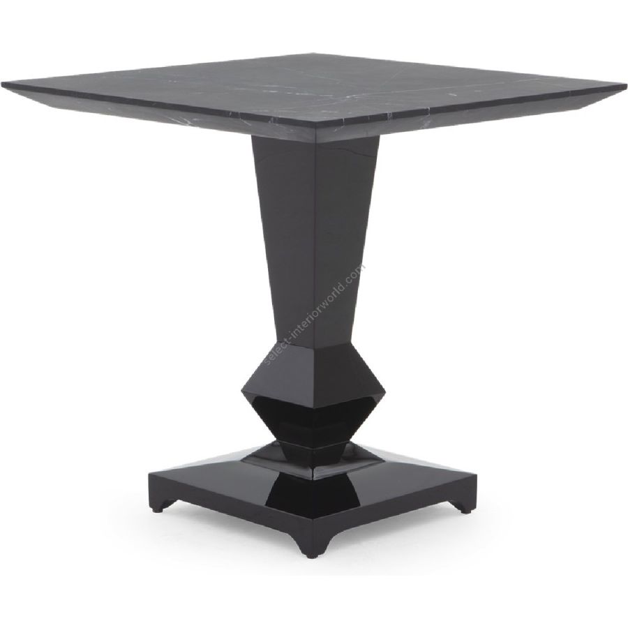 An impactful side table featuring a square top in Marquina marble and a hand-shaped base tapering into an angular square pedestal.