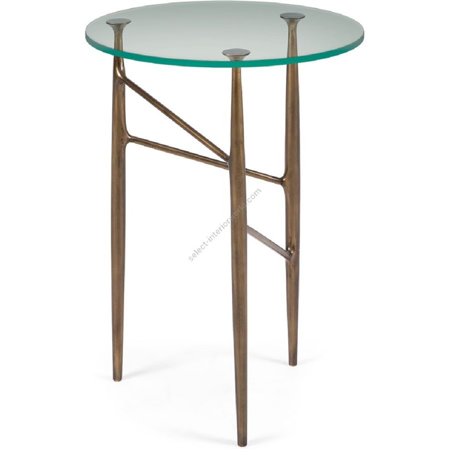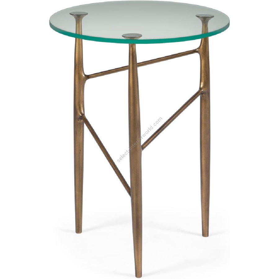 Solid aged brass lower base. Toughened tempered clear glass top. For residential use only. Commercial use is classified as Special Order Design (SOD), and alternative materials may be required. Contact us for details.