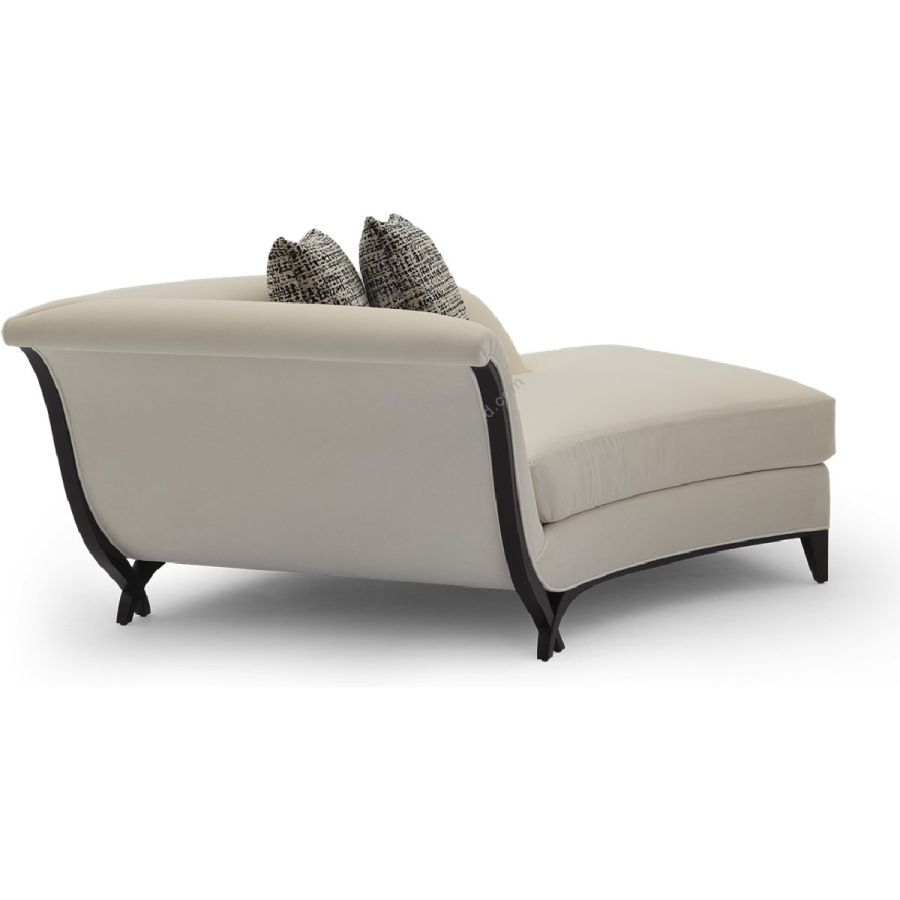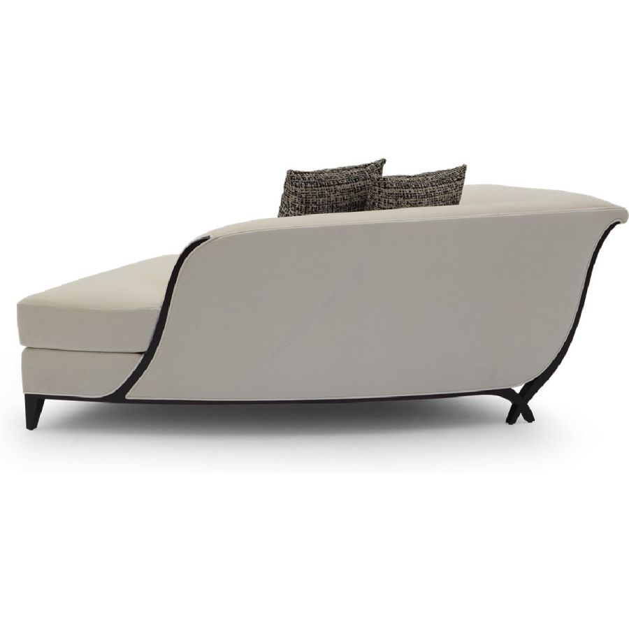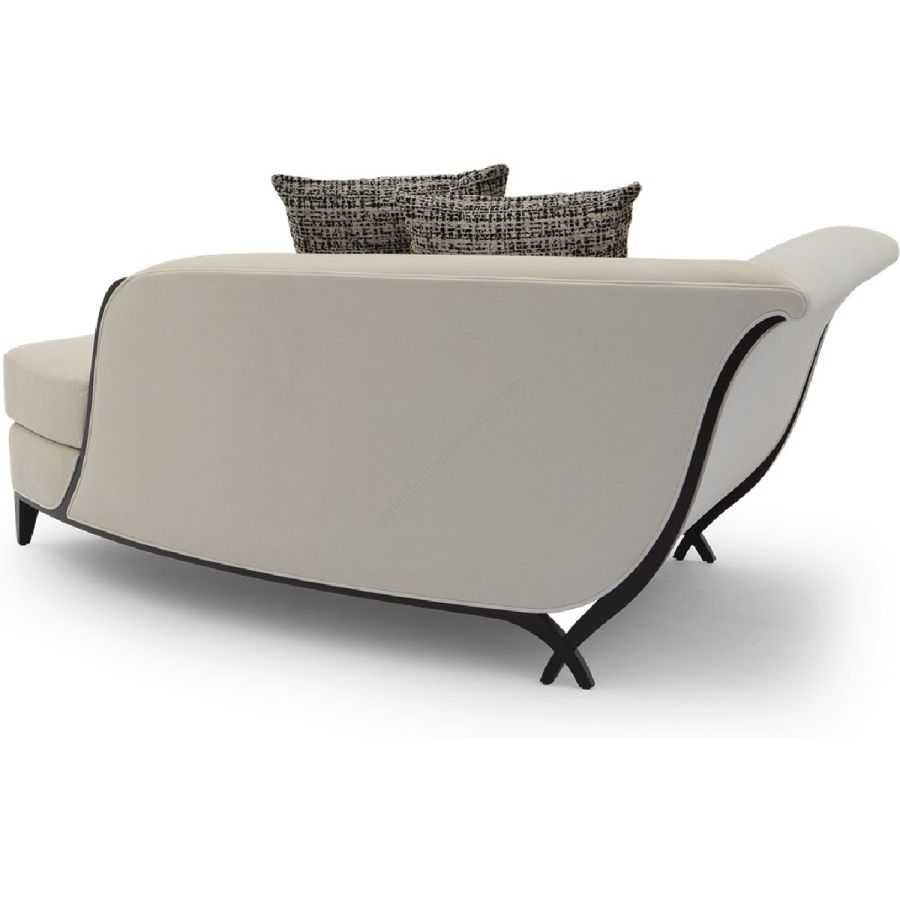 In an unusual sweeping trapezium shape, this is a stunning chaise that combines beauty with comfort. A gently curving back is complemented by a hand-carved frame and the signature Chris-cross legs. Also available in a right hand version (60-0578).