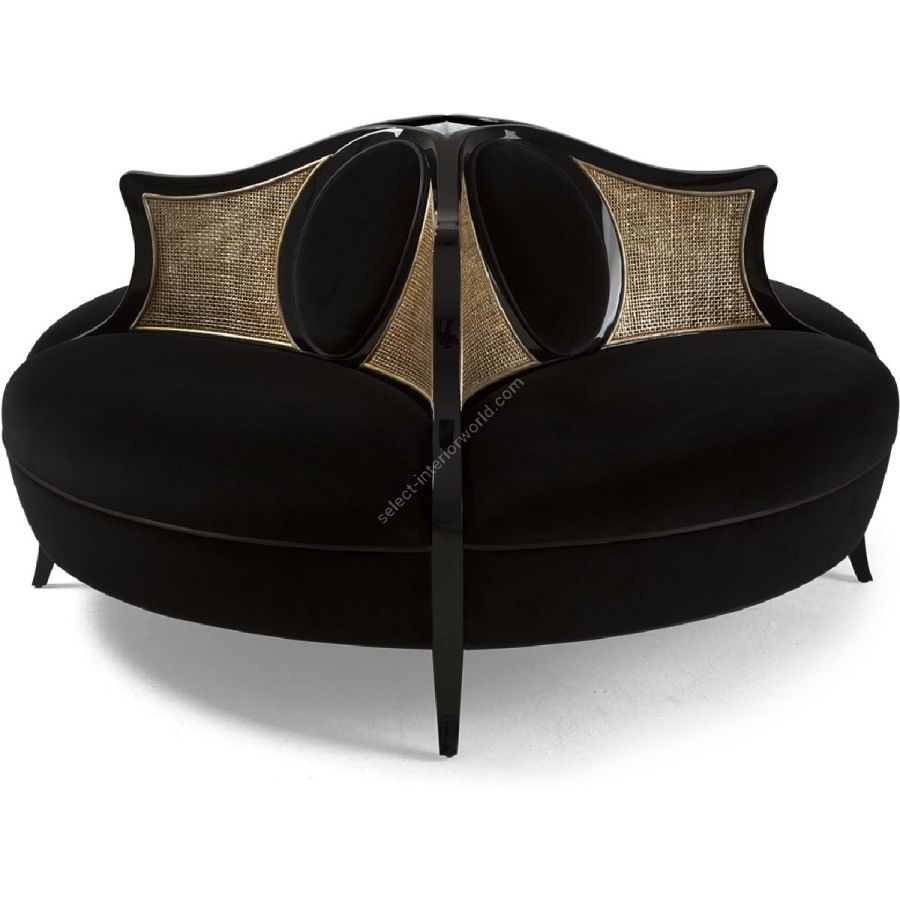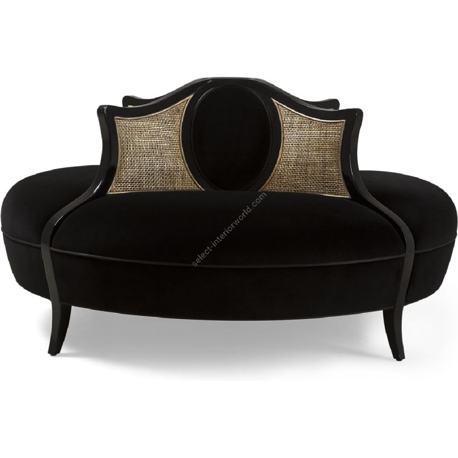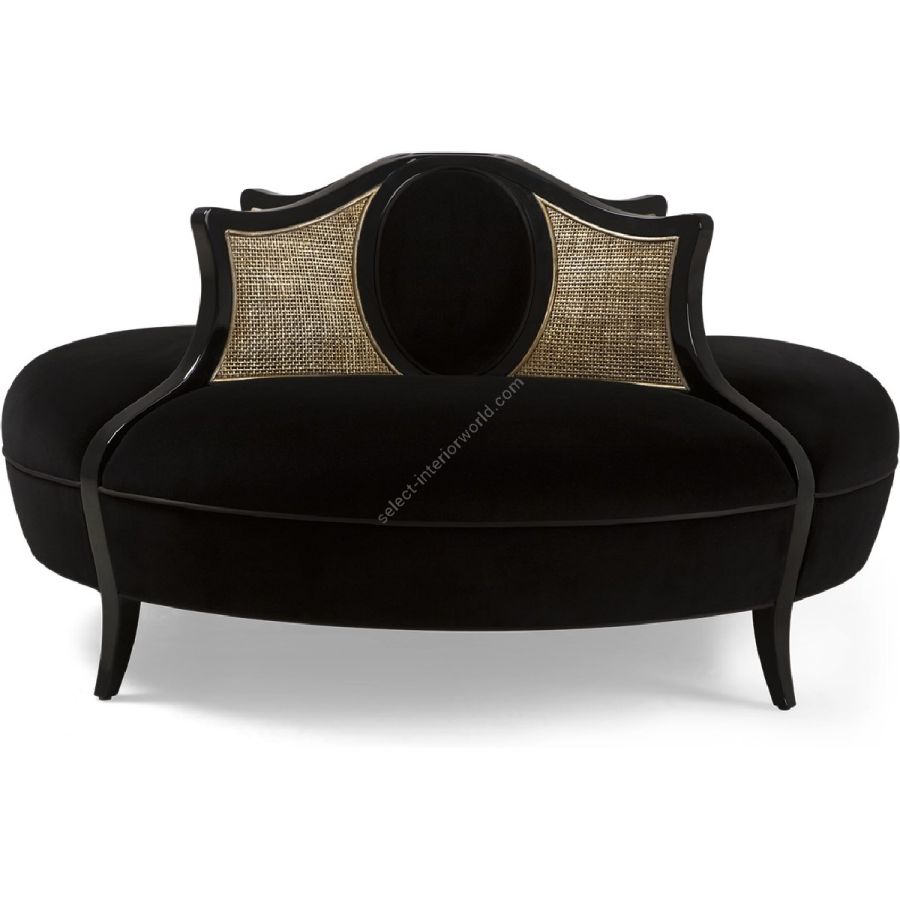 A beautifully stylish conversation seat with sweeping hand-carved wood dividers framing curved rattan, and elegant oval detailing. An outstanding feature piece.