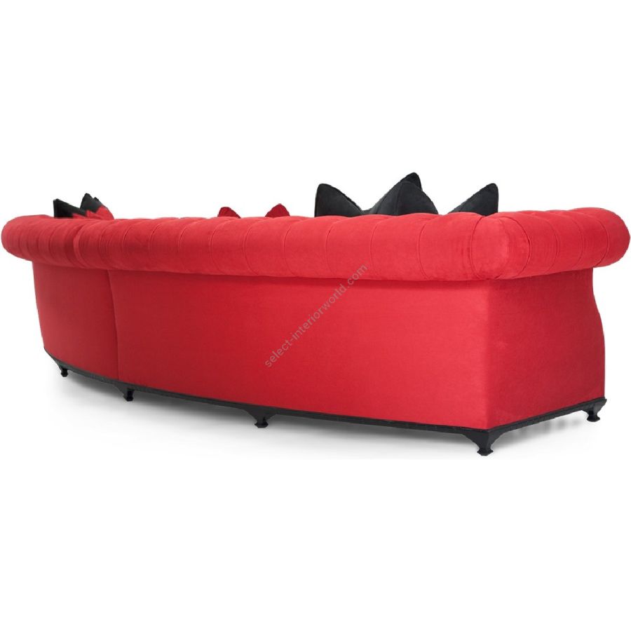 An extravagantly long curved sofa, with a hand carved base, that draws conversation in any setting, a contemporary twist on a timeless design.
