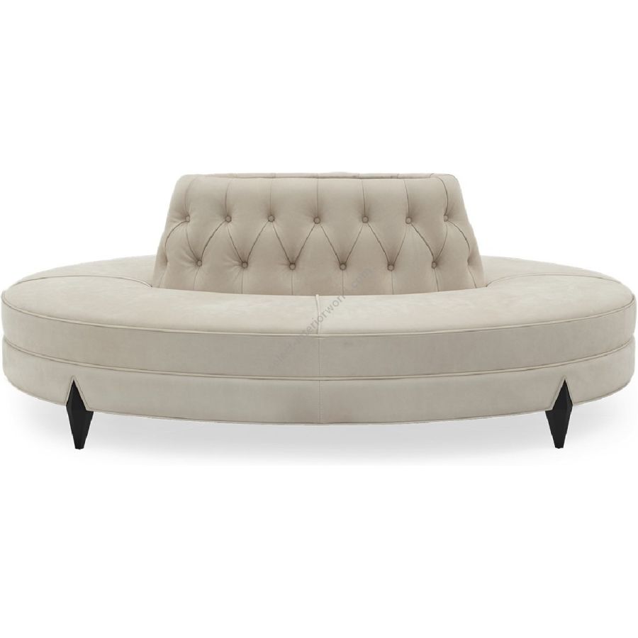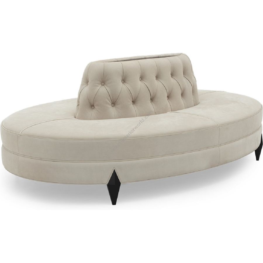 A sumptuous tufted back oval confidante, designed as a complimentary centerpiece for a magnificent lobby, hallway or dressing room.