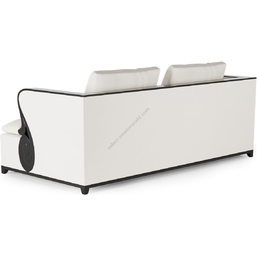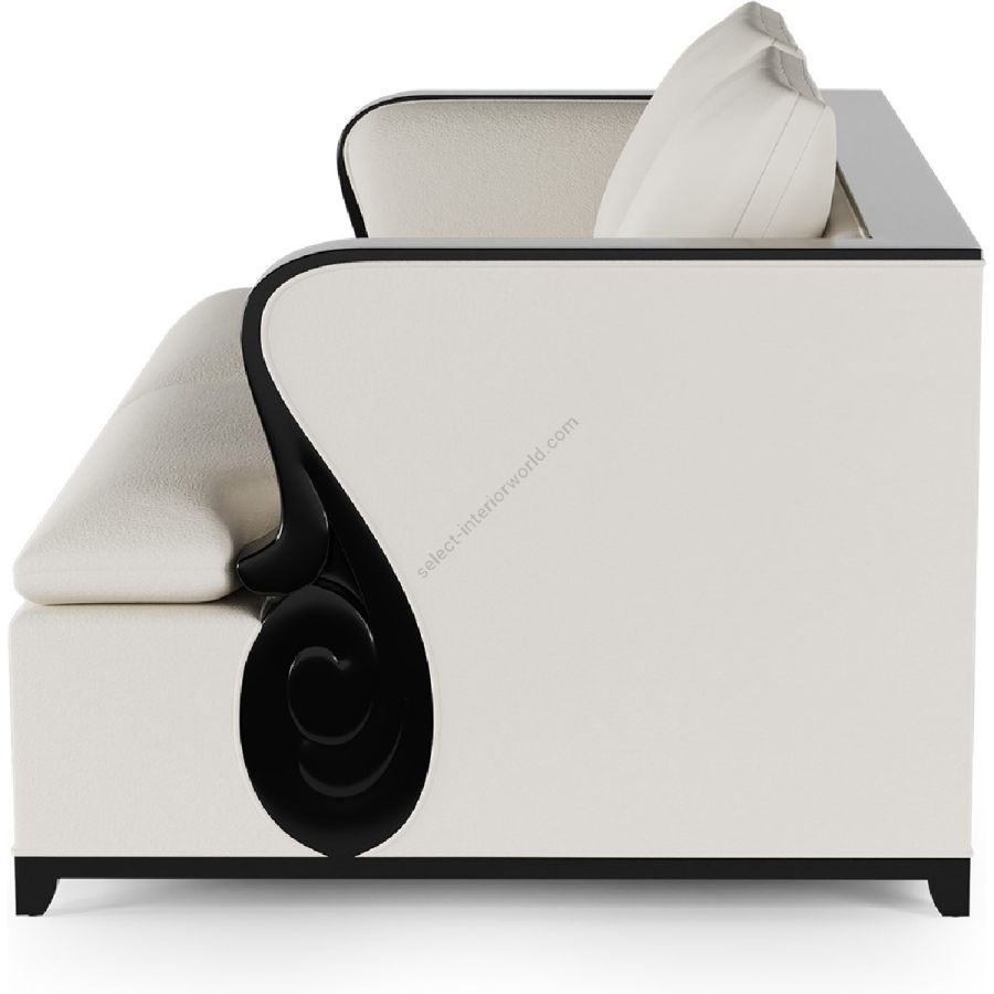 A fabulously chic sofa, featuring a carved mahogany ledge that flows along the arms and across the full length of the top surface to the opposite arm.