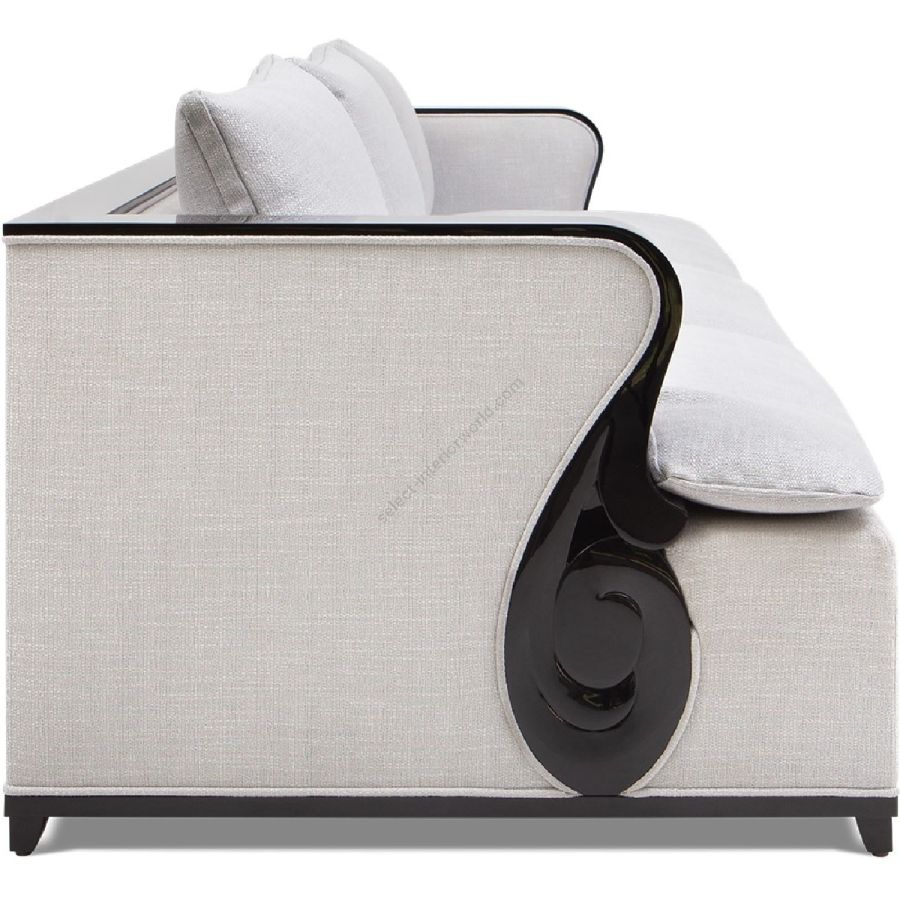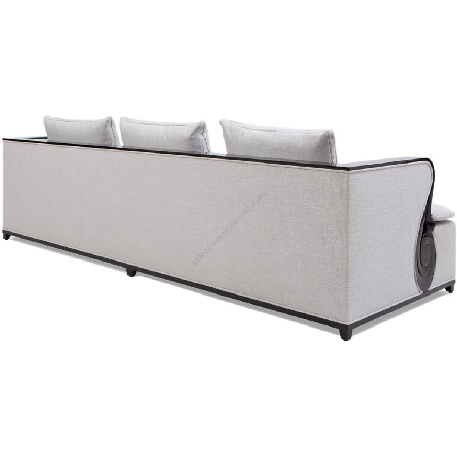 A fabulously chic sofa, featuring a carved mahogany ledge that flows along the arms and across the full length of the top surface to the opposite arm.