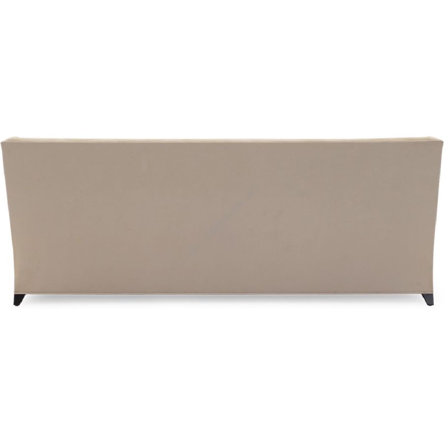 A clean and crisp square backed sofa featuring a hand carved mahogany frame with pyramid feet ideal for a contemporary mood.