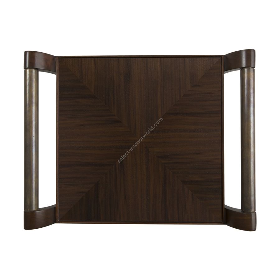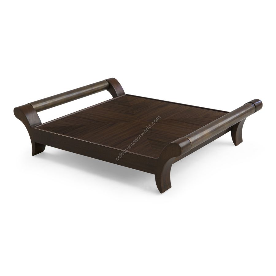 A simple, beautifully styled serving tray with pedestal feet extending into elegantly outward curved handles finished in brass.
