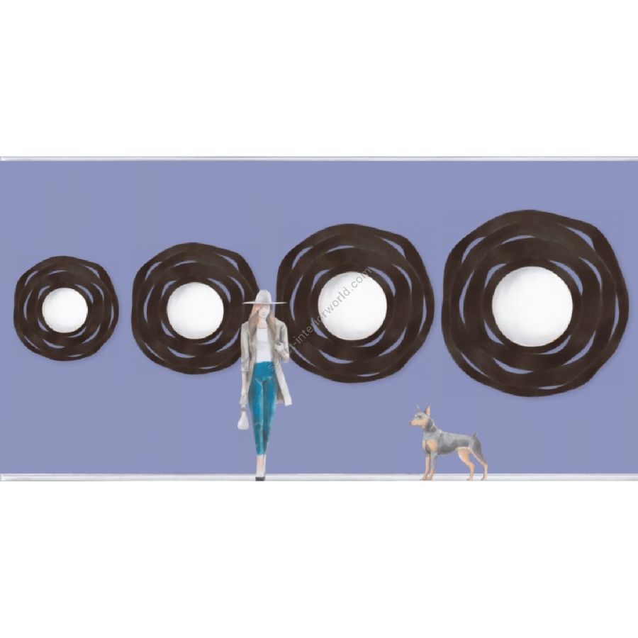 Four exquisitely carved concentric wood shaving circles surround a round mirror glass, creating a stunning 'apple peel' design.