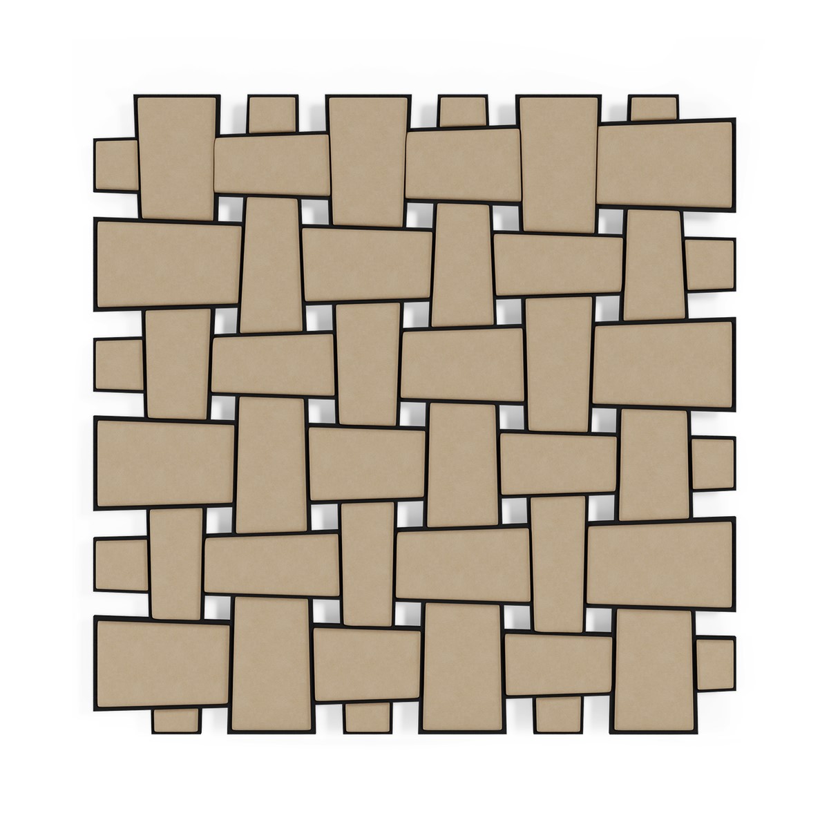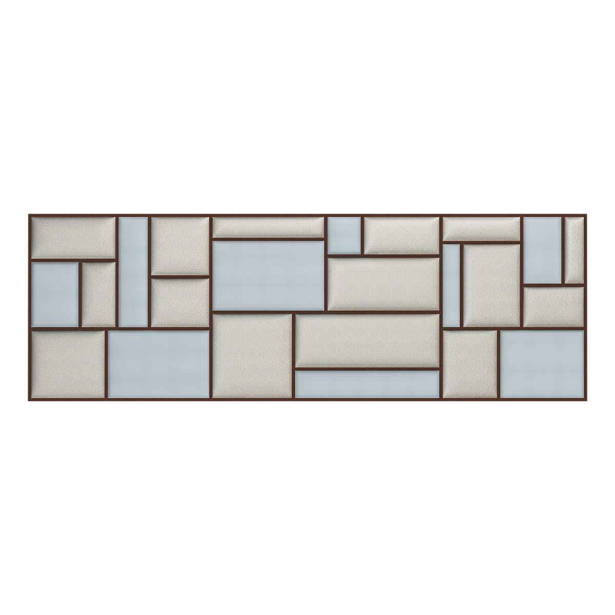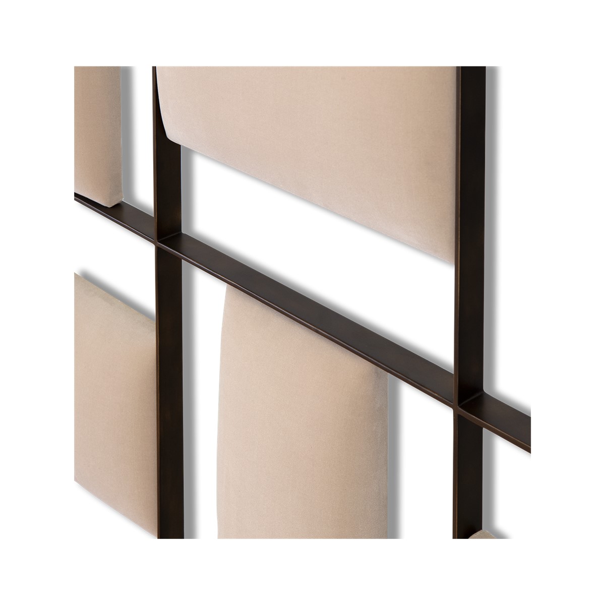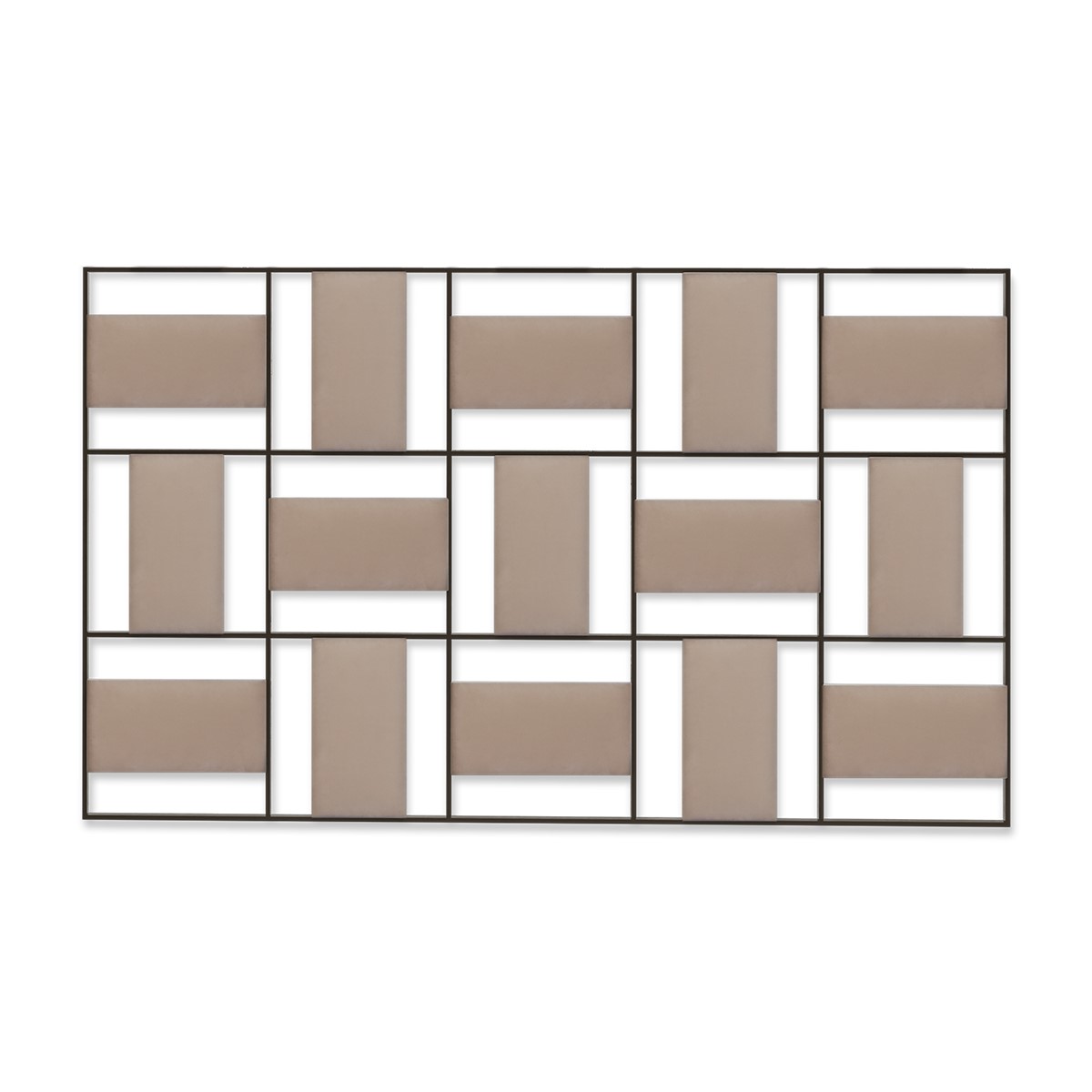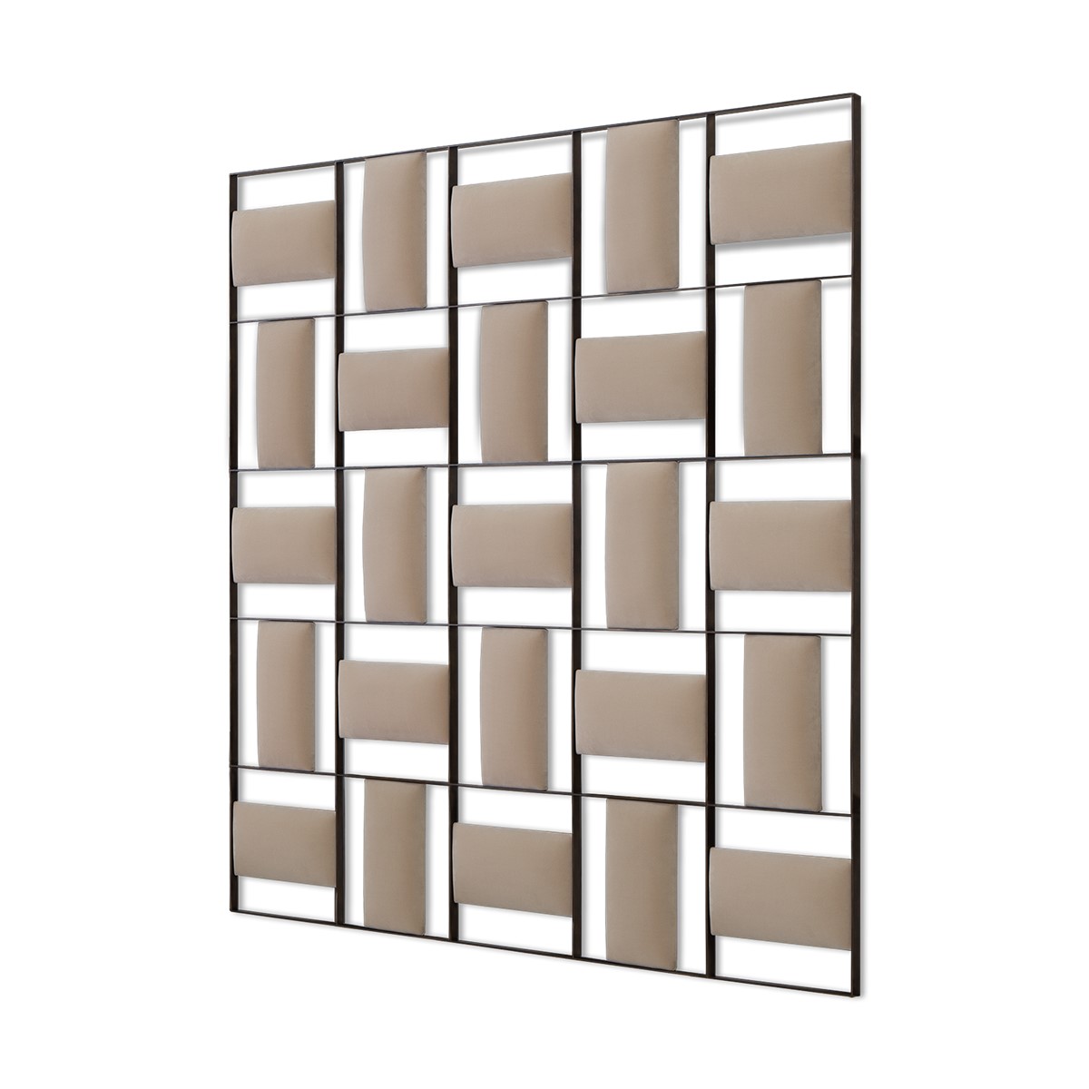 This contemporary styled headboard features perpendicular upholstered panels within a forged iron frame. A true statement piece!
