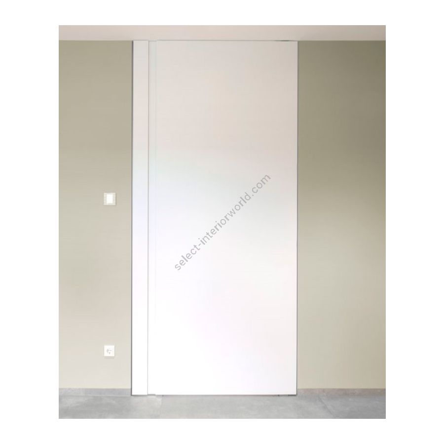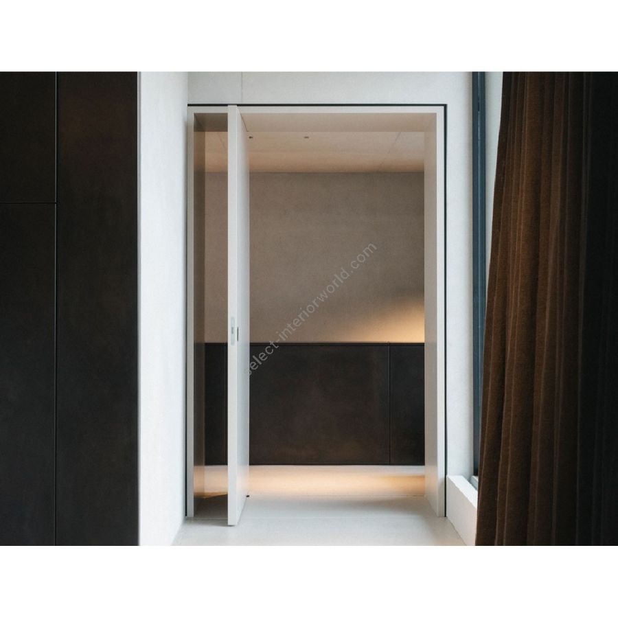 open up new possibilities for room partitioning, as they function in large dimensions (room-high or extra-wide) and the pivot sits at the top and bottom of the door leaf. The position of the pivot can be varied as well as the possibility to lock the door at 90°. This technology allows independent and adjustable soft closing.Wall connection