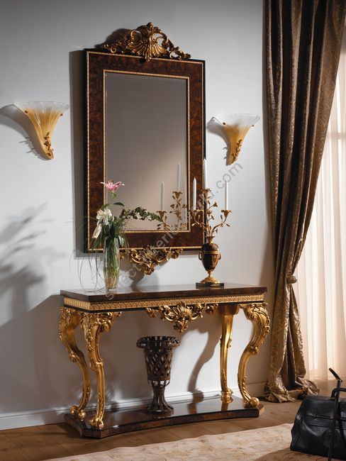VOLGA collection is produced in walnut veneer with elegant decoration in sicomore wood. Outstanding is the sand casted bronze with old gold finishing and the carved wood decorated in old gold leaf.