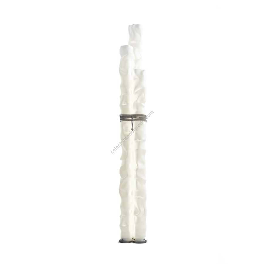 The Baggy Trio floor lamp is composed of three elements in double-satin polycarbonate diffusers of different heights – 150, 160 and 180 cm – with the irregular appearance of a crumpled paper tubes, while the base is in grey finish. The distinctive soft textile cord in white/grey – a detail that expresses the brand’s archi-decorative stylistic code – becomes a joining element for the table and floor variants adn supports the lamp in the suspended version.