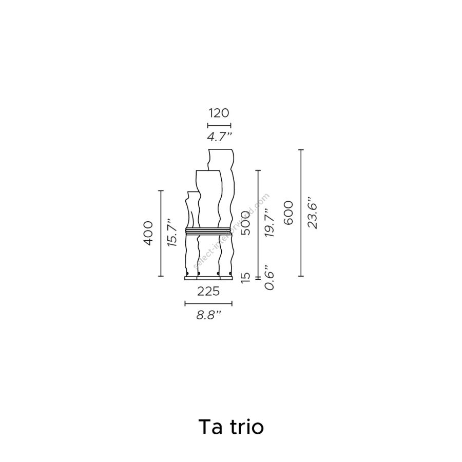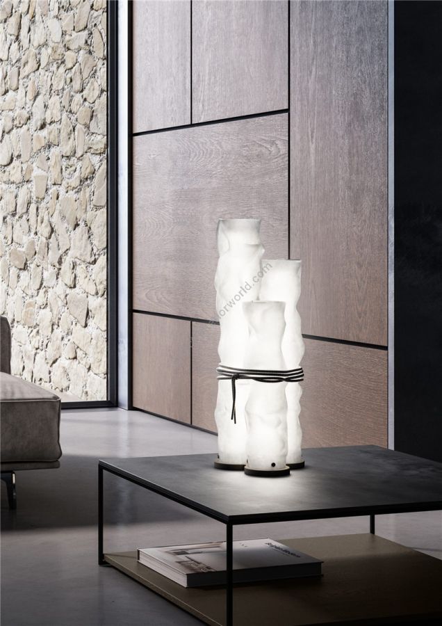 The Baggy Trio table lamp is composed of three elements in double-satin polycarbonate diffusers of different heights – 30, 50 and 60 cm – which have the irregular appearance of crumpled paper tubes, while the base is in grey finish. The distinctive soft textile cord in white/grey – a detail that expresses the brand’s archi-decorative stylistic code – becomes a joining element for the table and floor variants and supports the lamp in the suspended version.