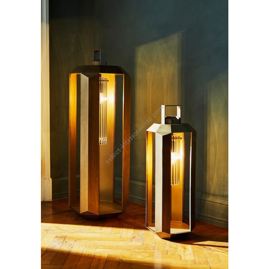 A table lantern in two dimensions. The external structure, in composite material, is finished in bronze using new painting techniques with metal powders: the satin bronze effect is so flawless that it is virtually impossible to tell whether it is metal or not. The inner part of the lantern is in gold-painted metal, which creates an elegant contrast. The ribbed glass of the diffuser enhances the product.