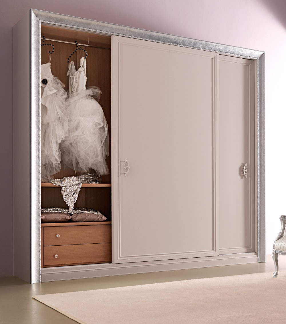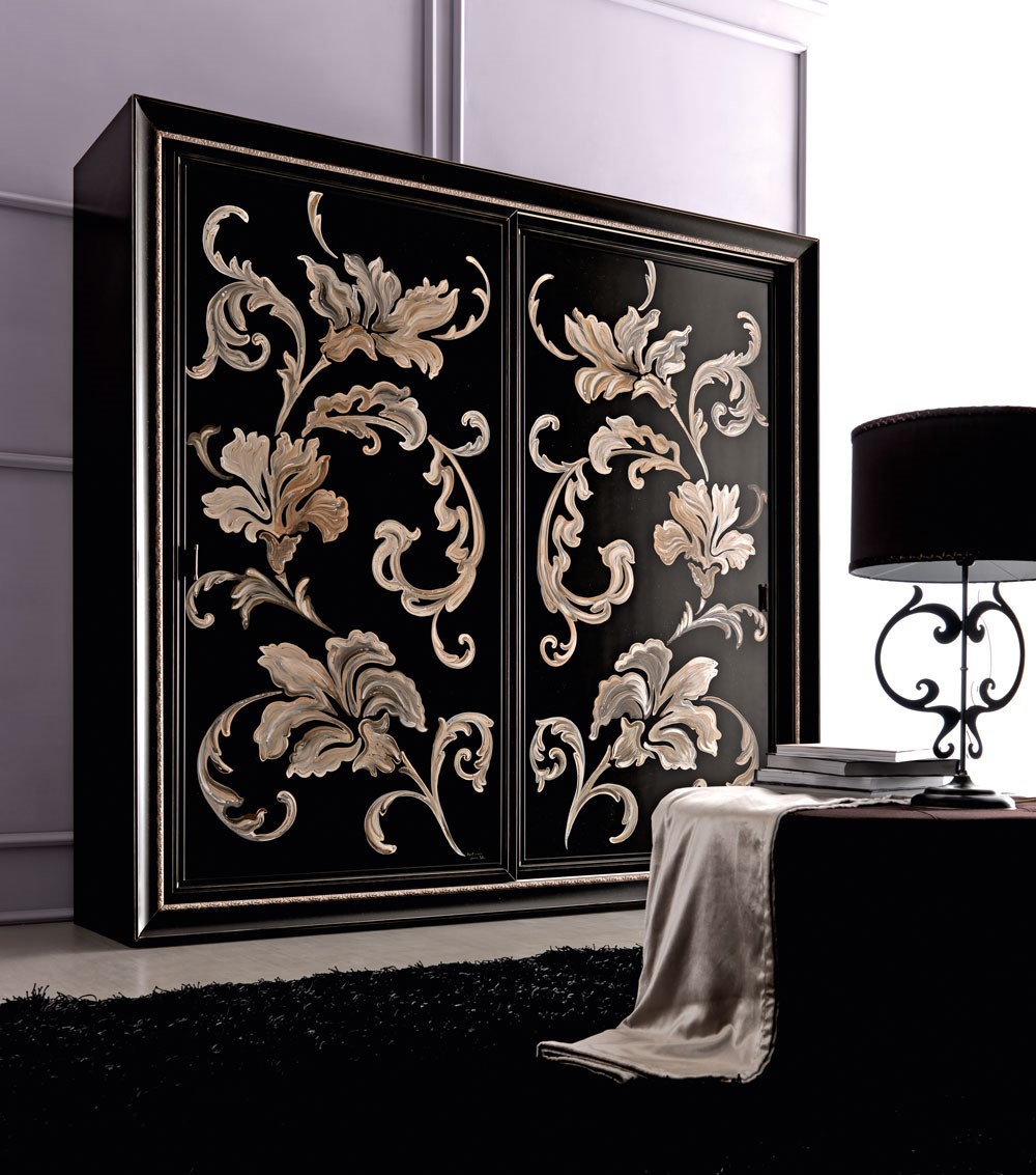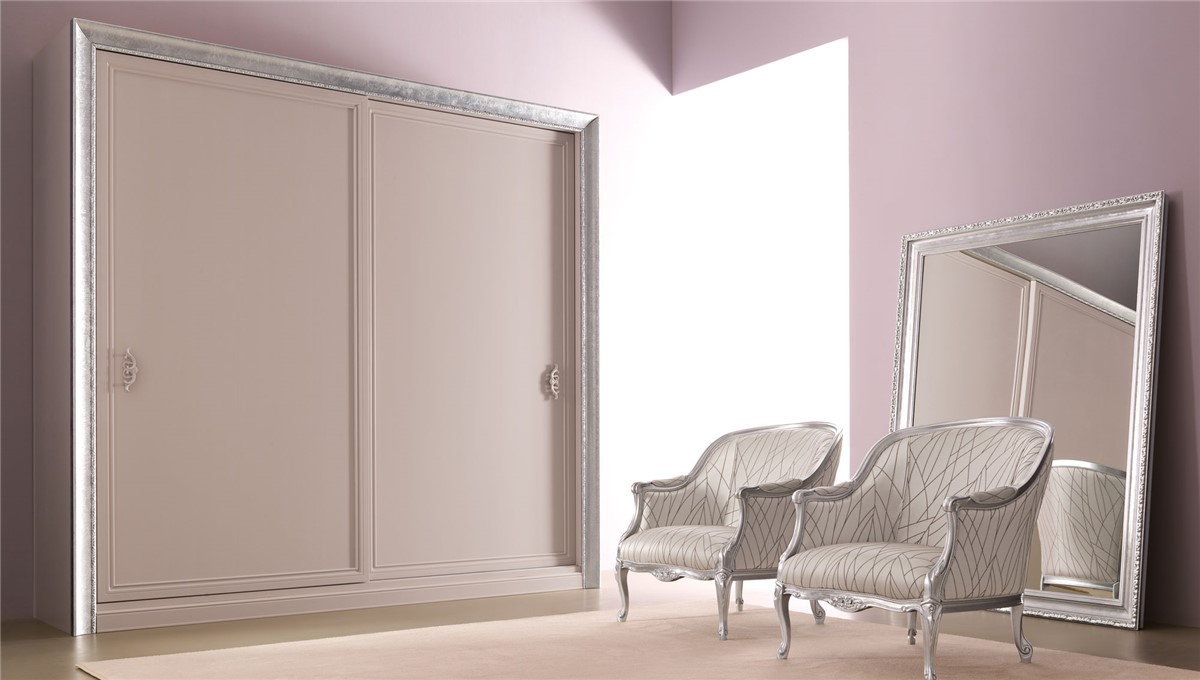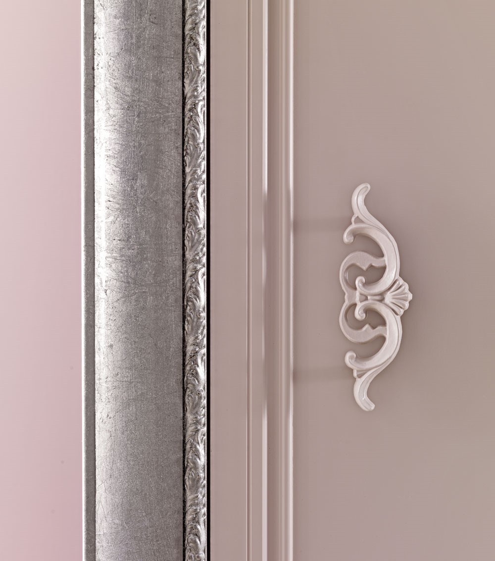 Wooden wardrobewith sliding or 4 hinged doors, with romantic and classic line, internally veneerend in walnut. Giusy is available in two different configurations: with portal or tatally framed. The precious materials, the handcratedmanufacturing, the prcious carved frame, make this wardrobe a work of art. Giusy is available with a wide range of handles to match to the chests and bedside tables collection, and has a large choice of finishings for bespoke solutions.