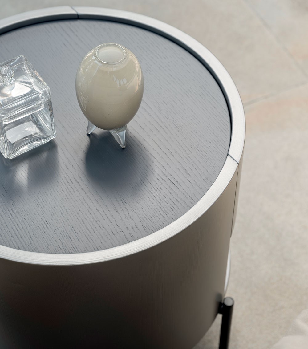 Wooden bedside table with 1 drawer and central compartment, with a simple and contemporary design. The style of the contemporary structure emphasises linearity and the detail of elegance. The metal base, colour-matched to the legs, supports the structure, giving it a light and comfortable appearance.
