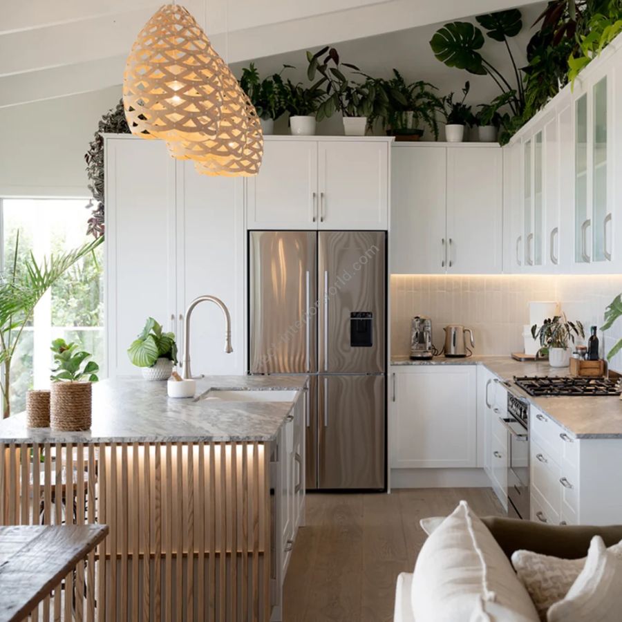 Half rings of bamboo are woven into a basket form that would sit perfectly over a dining table, kitchen counter or equally hanging in a stairwell or entrance void.